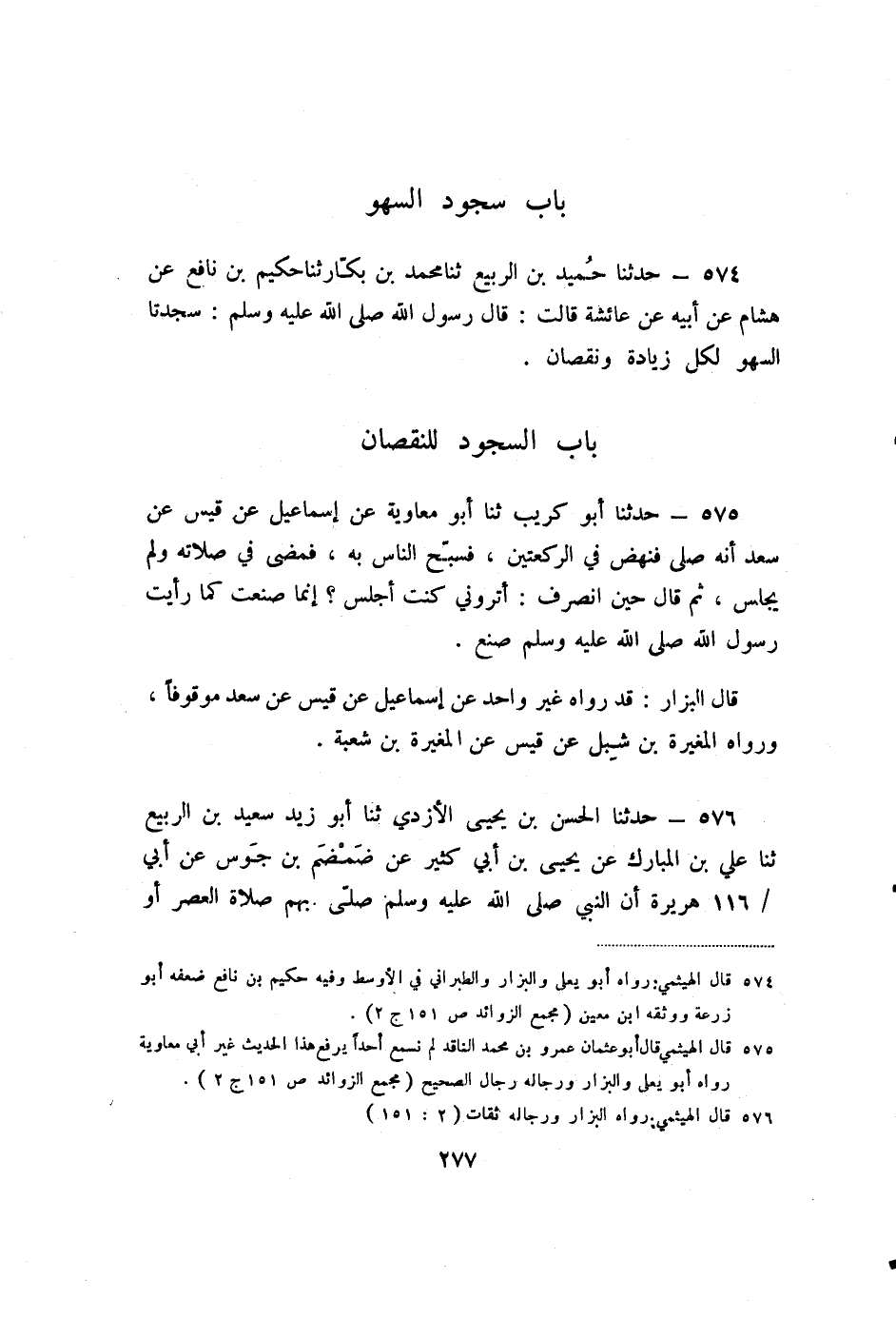 574 - حَدَّثَنَا حُمَيْدُ بْنُ الرَّبِيعِ، ثنا مُحَمَّدُ بْنُ بَكَّارٍ، ثنا حَكِيمُ بْنُ نَافِعٍ، عَنْ هِشَامٍ، عَنْ أَبِيهِ، عَنْ عَائِشَةَ، قَالَتْ: قَالَ رَسُولُ اللَّهِ صَلَّى اللَّهُ عَلَيْهِ وَسَلَّمَ: «سَجْدَتَا السَّهْوِ لِكُلِّ زِيَادَةٍ وَنُقْصَانٍ» .