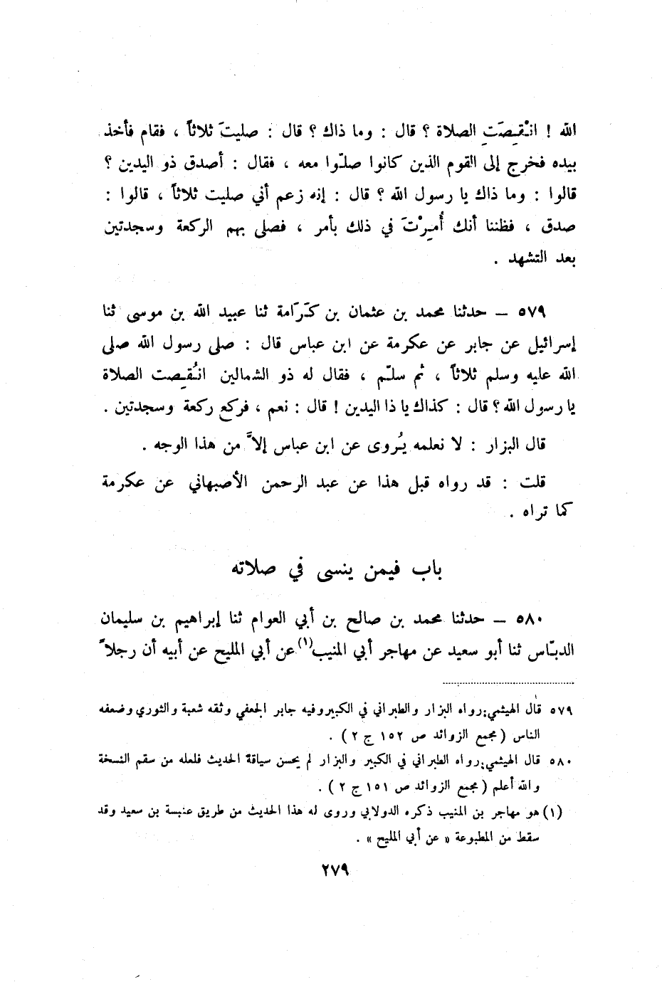 579 - حَدَّثَنَا مُحَمَّدُ بْنُ عُثْمَانَ بْنِ كَرَامَةَ، ثنا عُبَيْدُ اللَّهِ بْنُ مُوسَى، ثنا إِسْرَائِيلُ، عَنْ جَابِرٍ، عَنْ عِكْرِمَةَ، عَنِ ابْنِ عَبَّاسٍ، قَالَ: " صَلَّى رَسُولُ اللَّهِ صَلَّى اللَّهُ عَلَيْهِ وَسَلَّمَ ثَلاثًا، ثُمَّ سَلَّمَ، فَقَالَ لَهُ ذُو الشِّمَالَيْنِ: أَنُقِصَتِ الصَّلاةُ يَا رَسُولَ اللَّهِ؟ قَالَ: «كَذَاكَ يَا ذَا الْيَدَيْنِ؟ !» ، قَالَ: نَعَمْ، فَرَكَعَ رَكْعَةً وَسَجْدَتَيْنِ.