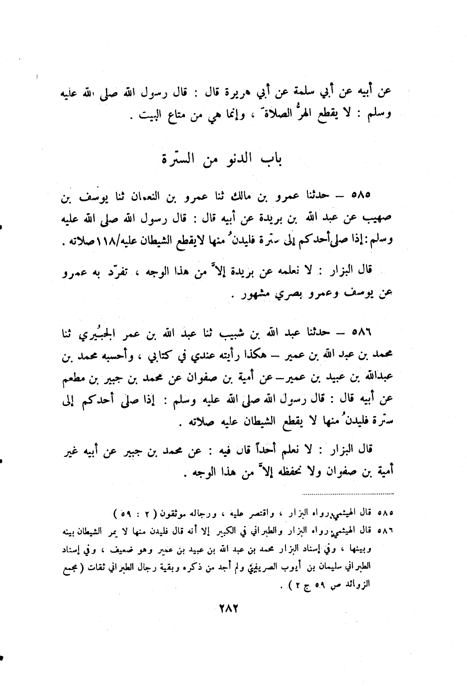 585 - حَدَّثَنَا عَمْرُو بْنُ مَالِكٍ، ثنا عَمْرُو بْنُ النُّعْمَانِ، ثنا يُوسُفُ بْنُ صُهَيْبٍ، عَنْ عَبْدِ اللَّهِ بْنِ بُرَيْدَةَ، عَنْ أَبِيهِ، قَالَ: قَالَ رَسُولُ اللَّهِ صَلَّى اللَّهُ عَلَيْهِ وَسَلَّمَ: «إِذَا صَلَّى أَحَدُكُمْ إِلَى سُتْرَةٍ فَلْيَدْنُ مِنْهَا لا يَقْطَعِ الشَّيْطَانُ عَلَيْهِ صَلاتَهُ» .