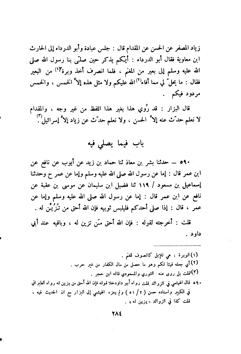 زِيَادٍ الْمُصَفِّرِ، عَنِ الْحَسَنِ، عَنِ الْمِقْدَامِ، قَالَ: جَلَسَ عُبَادَةُ وَأَبُو الدَّرْدَاءِ إِلَى الْحَارِثِ بْنِ مُعَاوِيَةَ، فَقَالَ أَبُو الدَّرْدَاءِ: أَيُّكُمْ يَذْكُرُ حِينَ صَلَّى بِنَا رَسُولُ اللَّهِ صَلَّى اللَّهُ عَلَيْهِ وَسَلَّمَ إِلَى بَعِيرٍ مِنَ الْمَغْنَمِ، فَلَمَّا انْصَرَفَ أَخَذَ وَبَرَةً مِنَ الْبَعِيرِ، فَقَالَ: «مَا يَحِلُّ لِي مِمَّا أَفَاءَ اللَّهُ عَلَيْكُمْ وَلا مِثْلُ هَذِهِ إِلا الْخُمُسَ، وَالْخُمُسُ مَرْدُودٌ فِيكُمْ» .