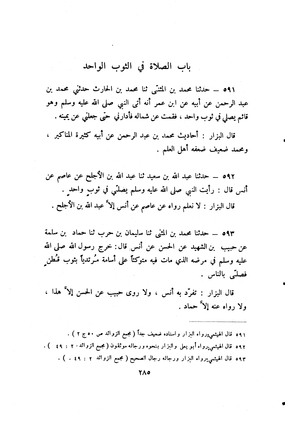 593 - حَدَّثَنَا مُحَمَّدُ بْنُ الْمُثَنَّى، ثنا سُلَيْمَانُ بْنُ حَرْبٍ، ثنا حَمَّادُ بْنُ سَلَمَةَ، عَنْ حَبِيبِ بْنِ الشَّهِيدِ، عَنِ الْحَسَنِ، عَنْ أَنَسٍ، قَالَ: خَرَجَ رَسُولُ اللَّهِ صَلَّى اللَّهُ عَلَيْهِ وَسَلَّمَ فِي مَرَضِهِ الَّذِي مَاتَ فِيهِ مُتَوَكِّئًا عَلَى أُسَامَةَ مُرْتَدِيًا بِثَوْبِ قُطْنٍ، فَصَلَّى بِالنَّاسِ.