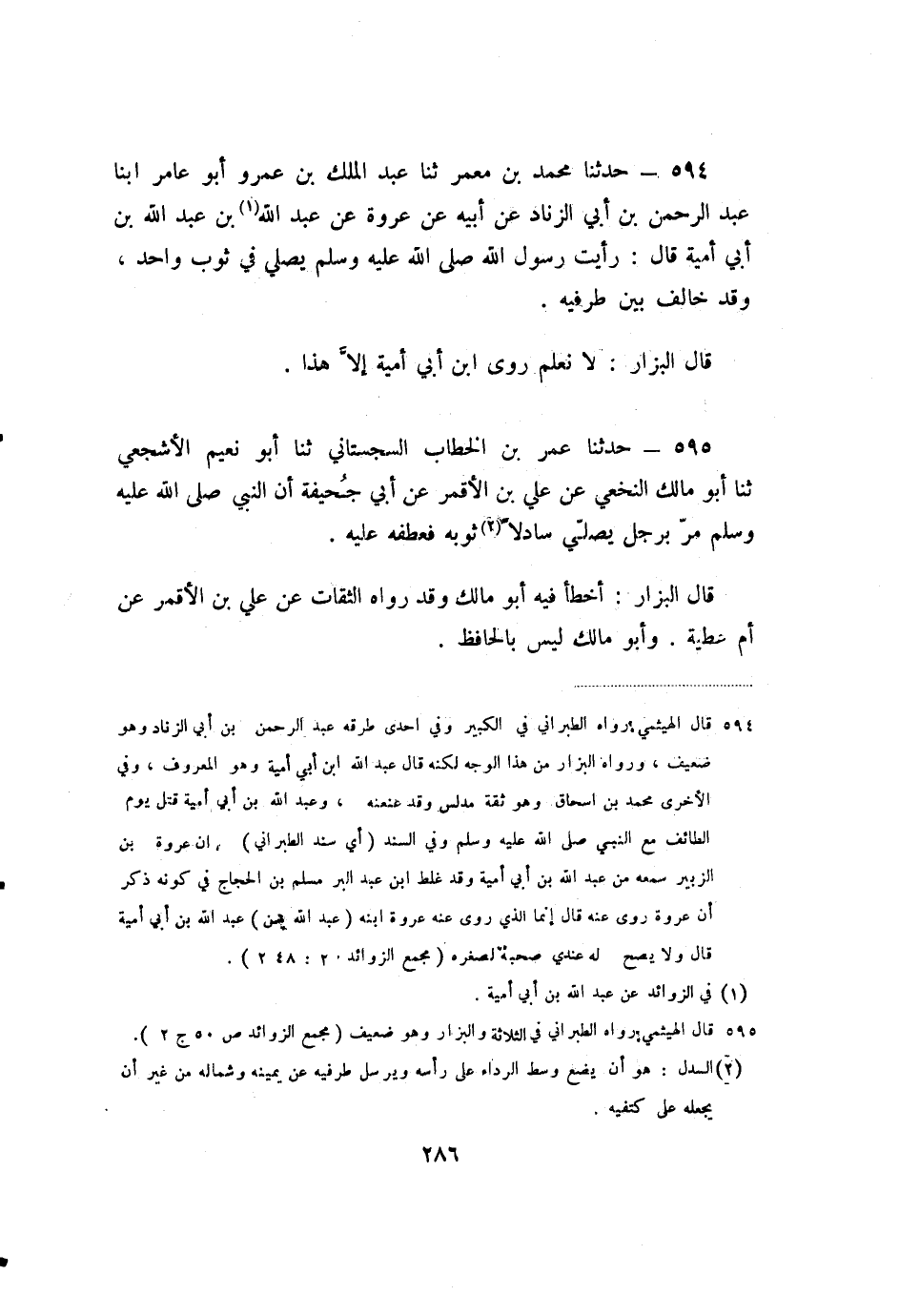 594 - حَدَّثَنَا مُحَمَّدُ بْنُ مَعْمَرٍ، ثنا عَبْدُ الْمَلِكِ بْنُ عَمْرٍو أَبُو عَامِرٍ، أنبا عَبْدُ الرَّحْمَنِ بْنُ أَبِي الزِّنَادِ، عَنْ أَبِيهِ، عَنْ عُرْوَةَ، عَنْ عَبْدِ اللَّهِ بْنِ عَبْدِ اللَّهِ بْنِ أَبِي أُمَيَّةَ، قَالَ: رَأَيْتُ رَسُولَ اللَّهِ صَلَّى اللَّهُ عَلَيْهِ وَسَلَّمَ يُصَلِّي فِي ثَوْبٍ وَاحِدٍ، وَقَدْ خَالَفَ بَيْنَ طَرَفَيْهِ.