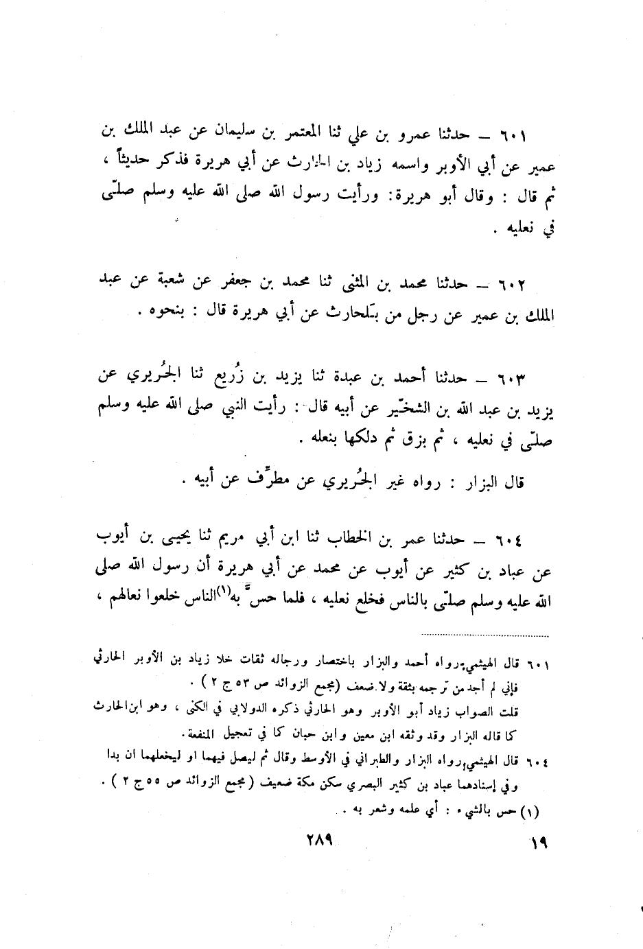 601 - حَدَّثَنَا عَمْرُو بْنُ عَلِيٍّ، ثنا الْمُعْتَمِرُ بْنُ سُلَيْمَانَ، عَنْ عَبْدِ الْمَلِكِ بْنِ عُمَيْرٍ، عَنْ أَبِي الأَوْبَرِ، وَاسْمُهُ زِيَادُ بْنُ الْحَارِثِ، عَنْ أَبِي هُرَيْرَة، فَذَكَرَ حَدِيثًا، ثُمَّ قَالَ: وَقَالَ أَبُو هُرَيْرَةَ: وَرَأَيْتُ رَسُولَ اللَّهِ صَلَّى اللَّهُ عَلَيْهِ وَسَلَّمَ صَلَّى فِي نَعْلَيْهِ.
