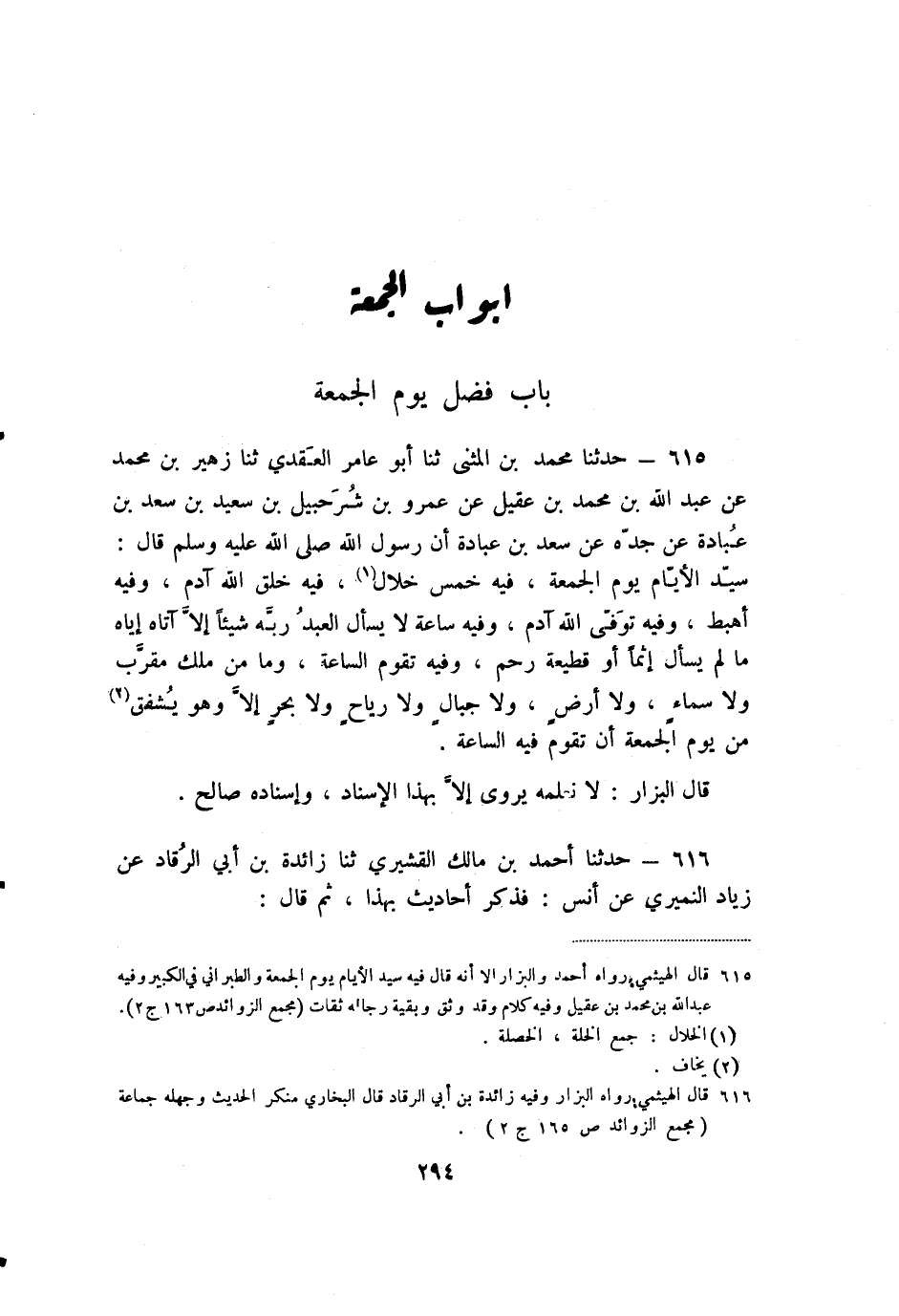 615 - حَدَّثَنَا مُحَمَّدُ بْنُ الْمُثَنَّى، ثنا أَبُو عَامِرٍ الْعَقَدِيُّ، ثنا زُهَيْرُ بْنُ مُحَمَّدٍ، عَنْ عَبْدِ اللَّهِ بْنِ مُحَمَّدِ بْنِ عَقِيلٍ، عَنْ عَمْرِو بْنِ شُرَحْبِيلَ بْنِ سَعِيدِ بْنِ سَعْدِ بْنِ عُبَادَةَ، عَنْ جَدِّهِ، عَنْ سَعْدِ بْنِ عُبَادَةَ، أَنَّ رَسُولَ اللَّهِ صَلَّى اللَّهُ عَلَيْهِ وَسَلَّمَ قَالَ: " سَيِّدُ الأَيَّامِ يَوْمُ الْجُمُعَةِ، فِيهِ خَمْسُ خِلالٍ: فِيهِ خَلَقَ اللَّهُ آدَمَ، وَفِيهِ أُهْبِطَ، وَفِيهِ تَوَفَّى اللَّهُ آدَمَ، وَفِيهِ سَاعَةٌ لا يَسْأَلُ الْعَبْدُ رَبَّهُ شَيْئًا إِلا آتَاهُ إِيَّاهُ، مَا لَمْ يَسْأَلْ إِثْمًا أَوْ قَطِيعَةَ رَحِمٍ، وَفِيهِ تَقُومُ السَّاعَةُ، وَمَا مِنْ مَلَكٍ مُقَرَّبٍ، وَلا سَمَاءٍ، وَلا أَرْضٍ، وَلا جِبَالٍ، وَلا رِيَاحٍ، وَلا بَحْرٍ إِلا وَهُوَ يُشْفِقُ مِنْ يَوْمِ الْجُمُعَةِ أَنْ تَقُومَ فِيهِ السَّاعَةُ ".