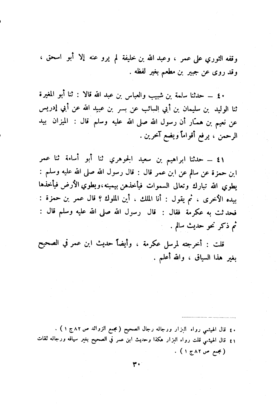 41 - حَدَّثَنَا إِبْرَاهِيمُ بْنُ سَعِيدٍ الْجَوْهَرِيُّ، ثنا أَبُو أُسَامَةَ، ثنا عُمَرُ بْنُ حَمْزَةَ، عَنْ سَالِمٍ، عَنِ ابْنِ عُمَرَ، قَالَ: قَالَ رَسُولُ اللَّهِ صَلَّى اللَّهُ عَلَيْهِ وَسَلَّمَ: " يَطْوِي اللَّهُ تَبَارَكَ وَتَعَالَى السَّمَوَاتِ، فَيَأْخُذُهُنَّ بِيَمِينِهِ، وَيَطْوِي الأَرْضَ، فَيَأْخُذُهَا بِيَدِهِ الأُخْرَى، ثُمَّ يَقُولُ: أَنَا الْمَلِكُ، أَيْنَ الْمُلُوكُ؟ "، قَالَ عُمَرُ بْنُ حَمْزَةَ: فَحَدَّثْتُ بِهِ عِكْرِمَةَ، فَقَالَ: قَالَ رَسُولُ اللَّهِ صَلَّى اللَّهُ عَلَيْهِ وَسَلَّمَ.