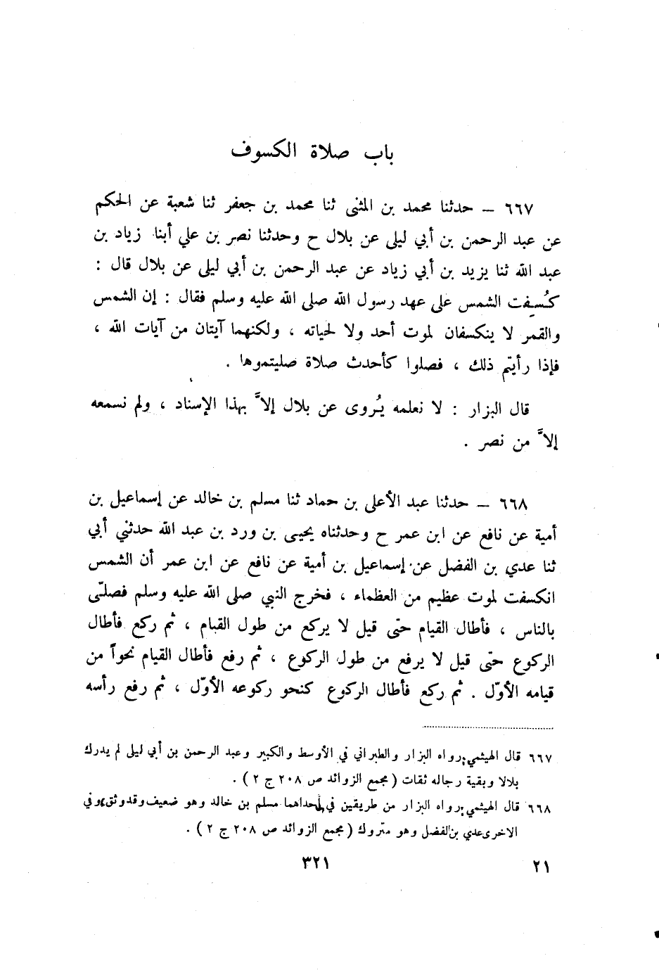 667 - حَدَّثَنَا مُحَمَّدُ بْنُ الْمُثَنَّى، ثنا مُحَمَّدُ بْنُ جَعْفَرٍ، ثنا شُعْبَةُ، عَنِ الْحَكَمِ، عَنْ عَبْدِ الرَّحْمَنِ بْنِ أَبِي لَيْلَى، عَنْ بِلالٍ، ح، وَحَدَّثَنَا نَصْرُ بْنُ عَلِيٍّ، أنبا زِيَادُ بْنُ عَبْدِ اللَّهِ، ثنا يَزِيدُ بْنُ أَبِي زِيَادٍ، عَنْ عَبْدِ الرَّحْمَنِ بْنِ أَبِي لَيْلَى، عَنْ بِلالٍ، قَالَ: كَسَفَتِ الشَّمْسُ عَلَى عَهْدِ رَسُولِ اللَّهِ صَلَّى اللَّهُ عَلَيْهِ وَسَلَّمَ، فَقَالَ: «إِنَّ الشَّمْسَ وَالْقَمَرَ لا يَنْكَسِفَانِ لِمَوْتِ أَحَدٍ وَلا لِحَيَاتِهِ، وَلَكِنَّهُمَا آيَتَانِ مِنْ آيَاتِ اللَّهِ، فَإِذَا رَأَيْتُمْ ذَلِكَ، فَصَلُّوا كَأَحْدَثِ صَلاةٍ صَلَّيْتُمُوهَا» .