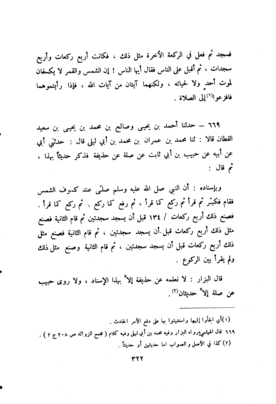 669 - حَدَّثَنَا أَحْمَدُ بْنُ يَحْيَى، وَصَالِحُ بْنُ مُحَمَّدِ بْنِ يَحْيَى بْنِ سَعِيدٍ الْقَطَّانُ، قَالا: ثنا مُحَمَّدُ بْنُ عِمْرَانَ بْنِ مُحَمَّدِ بْنِ أَبِي لَيْلَى، قَالَ: حَدَّثَنِي أَبِي، عَنْ أَبِيهِ، عَنْ حَبِيبِ بْنِ أَبِي ثَابِتٍ، عَنْ صِلَةَ، عَنْ حُذَيْفَةَ، فَذَكَرَ حَدِيثًا بِهَذَا، ثُمَّ قَالَ: وَبِإِسْنَادِهِ: أَنَّ النَّبِيَّ صَلَّى اللَّهُ عَلَيْهِ وَسَلَّمَ صَلَّى عِنْدَ كُسُوفِ الشَّمْسِ، فَقَامَ فَكَبَّرَ، ثُمَّ قَرَأَ، ثُمَّ رَكَعَ كَمَا قَرَأَ، ثُمَّ رَفَعَ كَمَا رَكَعَ، ثُمَّ رَكَعَ كَمَا قَرَأَ، فَصَنَعَ ذَلِكَ أَرْبَعَ رَكَعَاتٍ قَبْلَ أَنْ يَسْجُدَ سَجْدَتَيْنِ، ثُمَّ قَامَ الثَّانِيَةَ، فَصَنَعَ مِثْلَ ذَلِكَ أَرْبَعَ رَكَعَاتٍ قَبْلَ أَنْ يَسْجُدَ سَجْدَتَيْنِ، ثُمَّ قَامَ الثَّانِيَةَ، فَصَنَعَ مِثْلَ ذَلِكَ أَرْبَعَ رَكَعَاتٍ قَبْلَ أَنْ يَسْجُدَ سَجْدَتَيْنِ، ثُمَّ قَامَ الثَّانِيَةَ، وَصَنَعَ مِثْلَ ذَلِكَ، وَلَمْ يَقْرَأْ بَيْنَ الرُّكُوعِ.