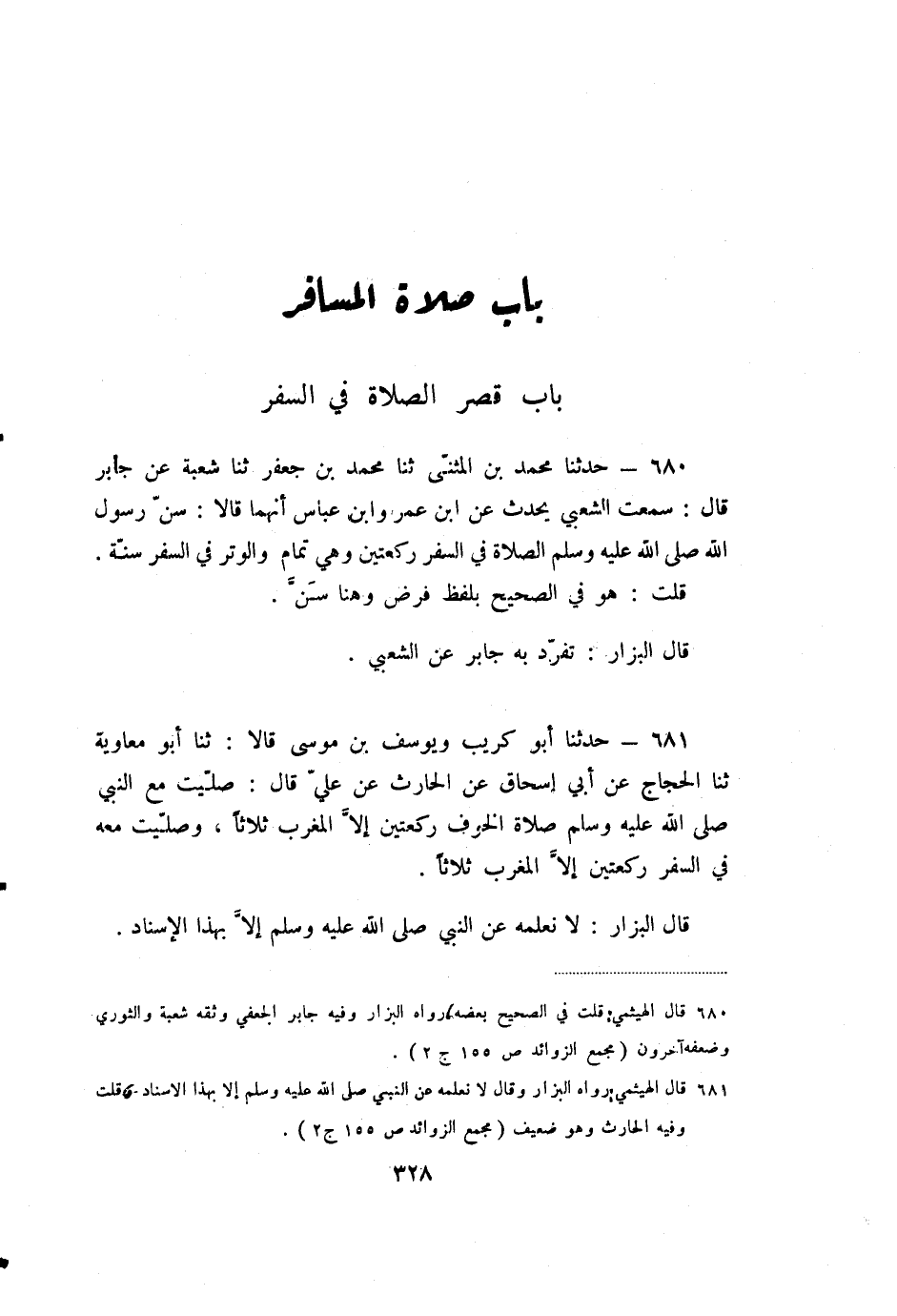 680 - حَدَّثَنَا مُحَمَّدُ بْنُ الْمُثَنَّى، ثنا مُحَمَّدُ بْنُ جَعْفَرٍ، ثنا شُعْبَةُ، عَنْ جَابِرٍ، قَالَ: سَمِعْتُ الشَّعْبِيَّ يُحَدِّثُ عَنِ ابْنِ عُمَرَ، وَابْنِ عَبَّاسٍ، أَنَّهُمَا قَالا: سَنَّ رَسُولُ اللَّهِ صَلَّى اللَّهُ عَلَيْهِ وَسَلَّمَ الصَّلاةَ فِي السَّفَرِ رَكْعَتَيْنِ، وَهِيَ تَمَامٌ، وَالْوِتْرَ فِي السَّفَرِ سُنَّةٌ.