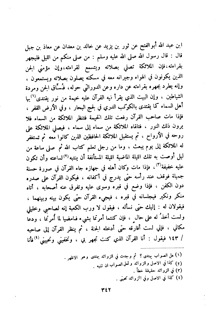 بْنُ عَبْدِ اللَّهِ أَبُو الْفَتْحِ، عَنْ ثَوْرِ بْنِ يَزِيدَ، عَنْ خَالِدِ بْنِ مَعْدَانَ، عَنْ مُعَاذِ بْنِ جَبَلٍ، قَالَ: قَالَ رَسُولُ اللَّهِ صَلَّى اللَّهُ عَلَيْهِ وَسَلَّمَ: " مَنْ صَلَّى مِنْكُمْ مِنَ اللَّيْلِ فَلْيَجْهَرْ بِقِرَاءَتِهِ، فَإِنَّ الْمَلائِكَةَ تُصَلِّي بِصَلاتِهِ، وَيُتَسَمَّعُ لِقِرَاءَتِهِ، وَإِنَّ مُؤْمِنِي الْجِنِّ الَّذِينَ يَكُونُونَ فِي الْهَوَاءِ وَجِيرَانَهُ مَعَهُ فِي مَسْكَنِهِ يُصَلُّونَ بِصَلاتِهِ وَيَسْتَمِعُونَ، وَإِنَّهُ يَطْرُدُ بِجَهْرِهِ بِقِرَاءَتِهِ عَنْ دَارِهِ، وَعَنِ الدُّورِ الَّتِي حَوْلَهُ فُسَّاقَ الْجِنِّ وَمَرَدَةَ الشَّيَاطِينِ، وَإِنَّ الْبَيْتَ الَّذِي يُقْرَأُ فِيهِ الْقُرْآنُ عَلَيْهِ خَيْمَةٌ مِنْ نُورٍ يَقْتَدِي بِهَا أَهْلُ السَّمَاءِ كَمَا يُقْتَدَى بِالْكَوْكَبِ الدُّرِّيِّ فِي لُجَجِ الْبِحَارِ، وَفِي الأَرْضِ الْقَفْرِ، فَإِذَا مَاتَ صَاحِبُ الْقُرْآنِ رُفِعَتْ تِلْكَ الْخَيْمَةُ، فَتَنْظُرُ الْمَلائِكَةُ مِنَ السَّمَاءِ، فَلا يَرَوْنَ ذَلِكَ النُّورَ، فَتَلَقَّاهُ الْمَلائِكَةُ مِنْ سَمَاءٍ إِلَى سَمَاءٍ، فَيُصَلِّي الْمَلائِكَةُ عَلَى رُوحِهِ فِي الأَرْوَاحِ، ثُمَّ يَسْتَقْبِلُ الْمَلائِكَةَ الْحَافِظِينَ الَّذِينَ كَانُوا مَعَهُ، ثُمَّ تَسْتَغْفِرُ لَهُ الْمَلائِكَةُ إِلَى يَوْمِ يُبْعَثُ، وَمَا مِنْ رَجُلٍ تَعَلَّمَ كِتَابَ اللَّهِ، ثُمَّ صَلَّى سَاعَةً مِنْ لَيْلٍ أَوْصَتْ بِهِ تِلْكَ اللَّيْلَةُ الْمَاضِيَةُ اللَّيْلَةَ الْمُسْتَأْنَفَةَ أَنْ يَنْتَبِهَ لِسَاعَتِهِ، وَأَنْ تَكُونَ عَلَيْهِ خَفِيفَةً، فَإِذَا مَاتَ وَكَانَ أَهْلُهُ فِي جِهَازِهِ جَاءَ الْقُرْآنُ فِي صُورَةٍ حَسَنَةٍ جَمِيلَةٍ، فَوَقَفَ عِنْدَ رَأْسِهِ حَتَّى يُدْرَجَ فِي أَكْفَانِهِ، فَيَكُونَ الْقُرْآنُ عَلَى صَدْرِهِ دُونَ الْكَفَنِ، فَإِذَا وُضِعَ فِي قَبْرِهِ وَسُوِّيَ عَلَيْهِ، وَتَفَرَّقَ عَنْهُ أَصْحَابُهُ، أَتَاهُ مُنْكَرٌ وَنَكِيرٌ فَيُجْلِسَانِهِ فِي قَبْرِهِ، فَيَجِيءُ الْقُرْآنُ حَتَّى يَكُونَ بَيْنَهُ وَبَيْنَهُمَا، فَيَقُولانِ لَهُ: إِلَيْكَ حَتَّى نَسْأَلَهُ، فَيَقُولُ: لا وَرَبِّ الْكَعْبَةِ إِنَّهُ لَصَاحِبِي وَخَلِيلِي وَلَسْتُ أَخْذِلُهُ عَلَى حَالٍ، فَإِنْ كُنْتُمَا أُمِرْتُمَا بِشَيْءٍ فَامْضِيَا لِمَا أُمِرْتُمَا، وَدَعَا مَكَانِي، فَإِنِّي لَسْتُ أُفَارِقُهُ حَتَّى أُدْخِلَهُ الْجَنَّةَ، ثُمَّ يَنْظُرُ الْقُرْآنُ إِلَى صَاحِبِهِ، فَيَقُولُ: أَنَا الْقُرْآنُ الَّذِي كُنْتَ تَجْهَرُ بِي، وَتُخْفِينِي وَتُحْيِينِي، فَأَنَا