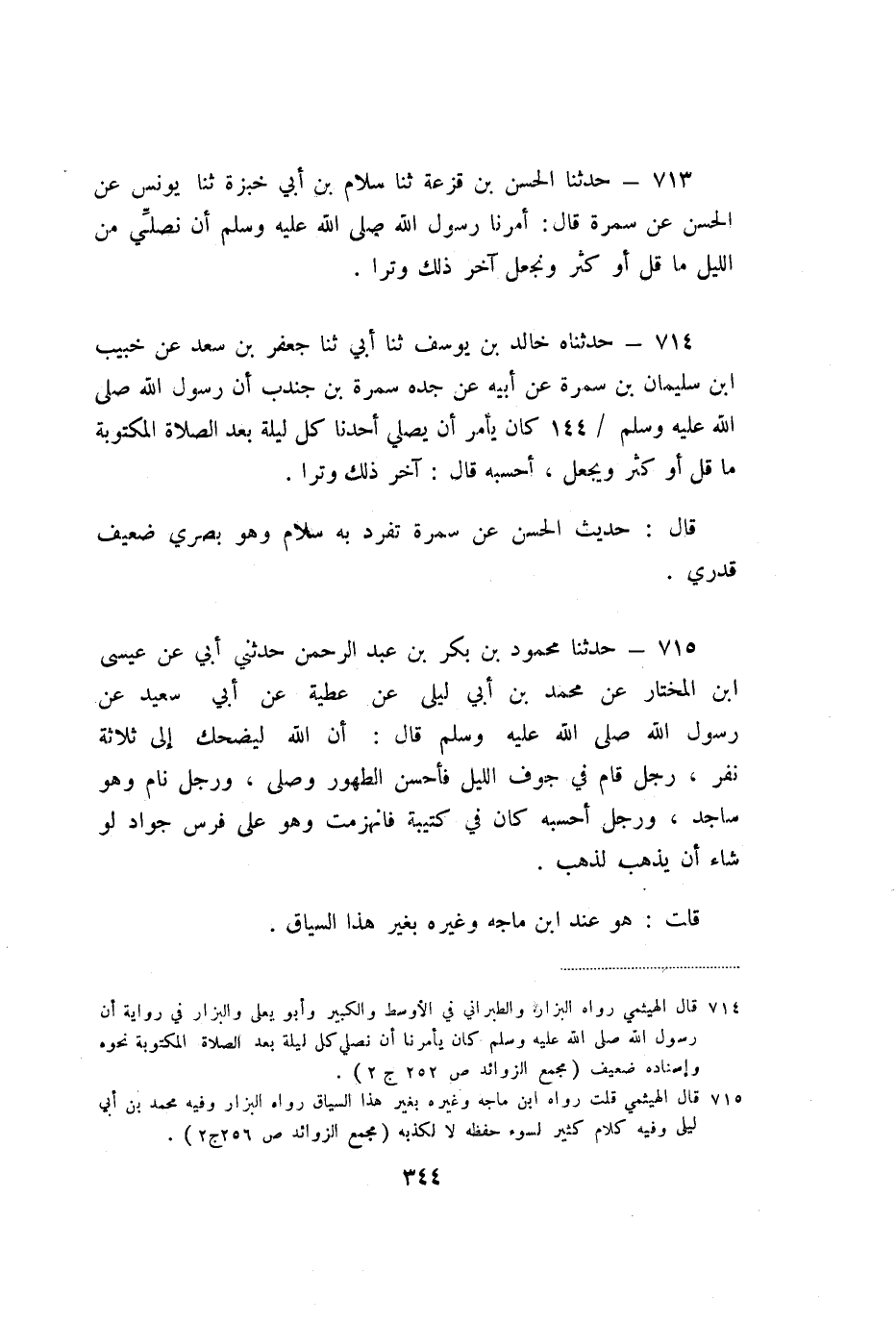 713 - حَدَّثَنَا الْحَسَنُ بْنُ قَزَعَةَ، ثنا سَلامُ بْنُ أَبِي خُبْزَةَ، ثنا يُونُسُ، عَنِ الْحَسَنِ، عَنْ سَمُرَةَ، قَالَ: أَمَرَنَا رَسُولُ اللَّهِ صَلَّى اللَّهُ عَلَيْهِ وَسَلَّمَ أَنْ «نُصَلِّيَ مِنَ اللَّيْلِ مَا قَلَّ أَوْ كَثُرَ وَنَجْعَلَ آخِرَ ذَلِكَ وِتْرًا» .