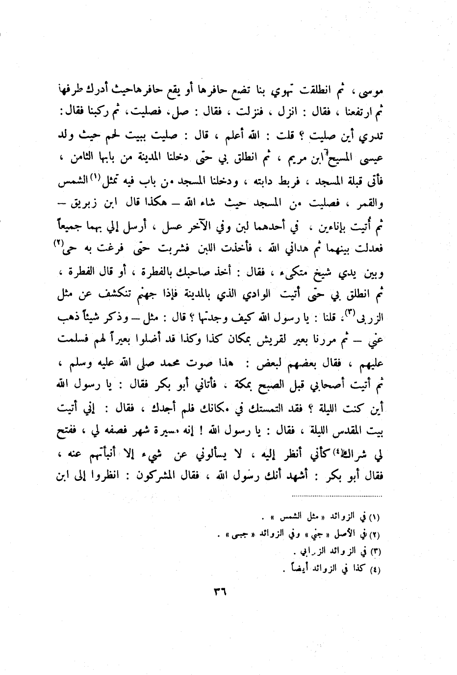 مُوسَى، ثُمَّ انْطَلَقَتْ تَهْوِي بِنَا تَضَعُ حَافِرَهَا، أَوْ يَقَعُ حَافِرُهَا حَيْثُ أَدْرَكَ طَرْفُهَا، ثُمَّ ارْتَفَعْنَا، فَقَالَ: انْزِلْ، فَنَزَلْتُ، فَقَالَ: صَلِّ، فَصَلَّيْتُ، ثُمَّ رَكِبْنَا، فَقَالَ: تَدْرِي أَيْنَ صَلَّيْتَ؟ قُلْتُ: اللَّهُ أَعْلَمُ، قَالَ: صَلَّيْتَ بِبَيْتِ لَحْمٍ حَيْثُ وُلِدَ عِيسَى الْمَسِيحُ ابْنُ مَرْيَمَ، ثُمَّ انْطَلَقَ بِي حَتَّى دَخَلْنَا الْمَدِينَةَ مِنْ بَابِهَا الثَّامِنِ، فَأَتَى قِبْلَةَ الْمَسْجِدِ، فَرَبَطَ دَابَّتَهُ، وَدَخَلْنَا الْمَسْجِدَ مِنْ بَابٍ فِيهِ تَمِيلُ الشَّمْسُ وَالْقَمَرُ، فَصَلَّيْتُ مِنَ الْمَسْجِدِ حَيْثُ شَاءَ اللَّهُ هَكَذَا قَالَ ابْنُ زِبْرِيقٍ ثُمَّ أُتِيتُ بِإِنَاءَيْنِ، فِي أَحَدِهِمَا لَبَنٌ وَفِي الآخَرِ عَسَلٌ، أُرْسِلَ إِلَيَّ بِهِمَا جَمِيعًا، فَعَدَلْتُ بَيْنَهُمَا ثُمَّ هَدَانِي اللَّهُ، فَأَخَذْتُ اللَّبَنَ فَشَرِبْتُ حَتَّى فَرَغَتْ بِهِ جُبِّي وَبَيْنَ يَدَيَّ شَيْخٌ مُتَّكِئٌ، فَقَالَ: أَخَذَ صَاحِبُكَ بِالْفِطْرَةِ، أَوْ قَالَ الْفِطْرَةَ، ثُمَّ انْطَلَقَ بِي حَتَّى أَتَيْتُ الْوَادِيَ الَّذِي بِالْمَدِينَةِ فَإِذَا جَهَنَّمُ تَنْكَشِفُ عَنْ مِثْلِ الزَّرْبَى، قُلْنَا: يَا رَسُولَ اللَّهِ كَيْفَ وَجَدْتَهَا؟ قَالَ: مِثْلَ وَذَكَرَ شَيْئًا ذَهَبَ عَنِّي، ثُمَّ مَرَرْنَا بِعِيرٍ لِقُرَيْشٍ بِمَكَانِ كَذَا وَكَذَا قَدْ أَضَلُّوا بَعِيرًا لَهُمْ، فَسَلَّمْتُ عَلَيْهِمْ، فَقَالَ بَعْضُهُمْ لِبَعْضٍ: هَذَا صَوْتُ مُحَمَّدٍ صَلَّى اللَّهُ عَلَيْهِ وَسَلَّمَ، ثُمَّ أَتَيْتُ أَصْحَابِي قَبْلَ الصُّبْحِ بِمَكَّةَ، فَأَتَانِي أَبُو بَكْرٍ، فَقَالَ: يَا رَسُولَ اللَّهِ أَيْنَ كُنْتَ اللَّيْلَةَ؟ فَقَدِ الْتَمَسْتُكَ فِي مَكَانِكَ فَلَمْ أَجِدْكَ، فَقَالَ: إِنِّي أَتَيْتُ بَيْتَ الْمَقْدِسِ اللَّيْلَةَ، فَقَالَ: يَا رَسُولَ اللَّهِ! إِنَّهُ مَسِيرَةُ شَهْرٍ فَصِفْهُ لِي، فَفُتِحَ لِي شِرَاكٌ كَأَنِّي أَنْظُرُ إِلَيْهِ، لا يَسْأَلُونِي عَنْ شَيْءٍ إِلا أَنْبَأْتُهُمْ عَنْهُ، فَقَالَ أَبُو بَكْرٍ: أَشْهَدُ أَنَّكَ رَسُولُ اللَّهِ، فَقَالَ الْمُشْرِكُونَ: انْظُرُوا إِلَى ابْنِ