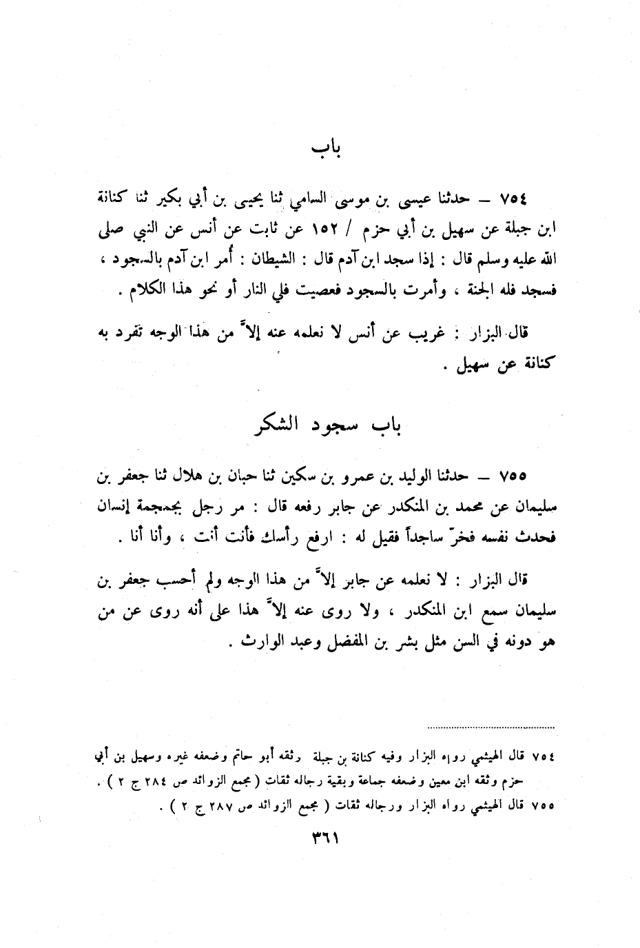 755 - حَدَّثَنَا الْوَلِيدُ بْنُ عَمْرِو بْنِ سُكَيْنٍ، ثنا حِبَّانُ بْنُ هِلالٍ، ثنا جَعْفَرُ بْنُ سُلَيْمَانَ، عَنْ مُحَمَّدِ بْنِ الْمُنْكَدِرِ، عَنْ جَابِرٍ، رَفَعَهُ قَالَ: " مَرَّ رَجُلٍ بِجُمْجُمَةِ إِنْسَانٍ، فَحَدَّثَ نَفْسَهُ فَخَرَّ سَاجِدًا، فَقِيلَ لَهُ: ارْفَعْ رَأْسَكَ فَأَنْتَ أَنْتَ، وَأَنَا أَنَا ".