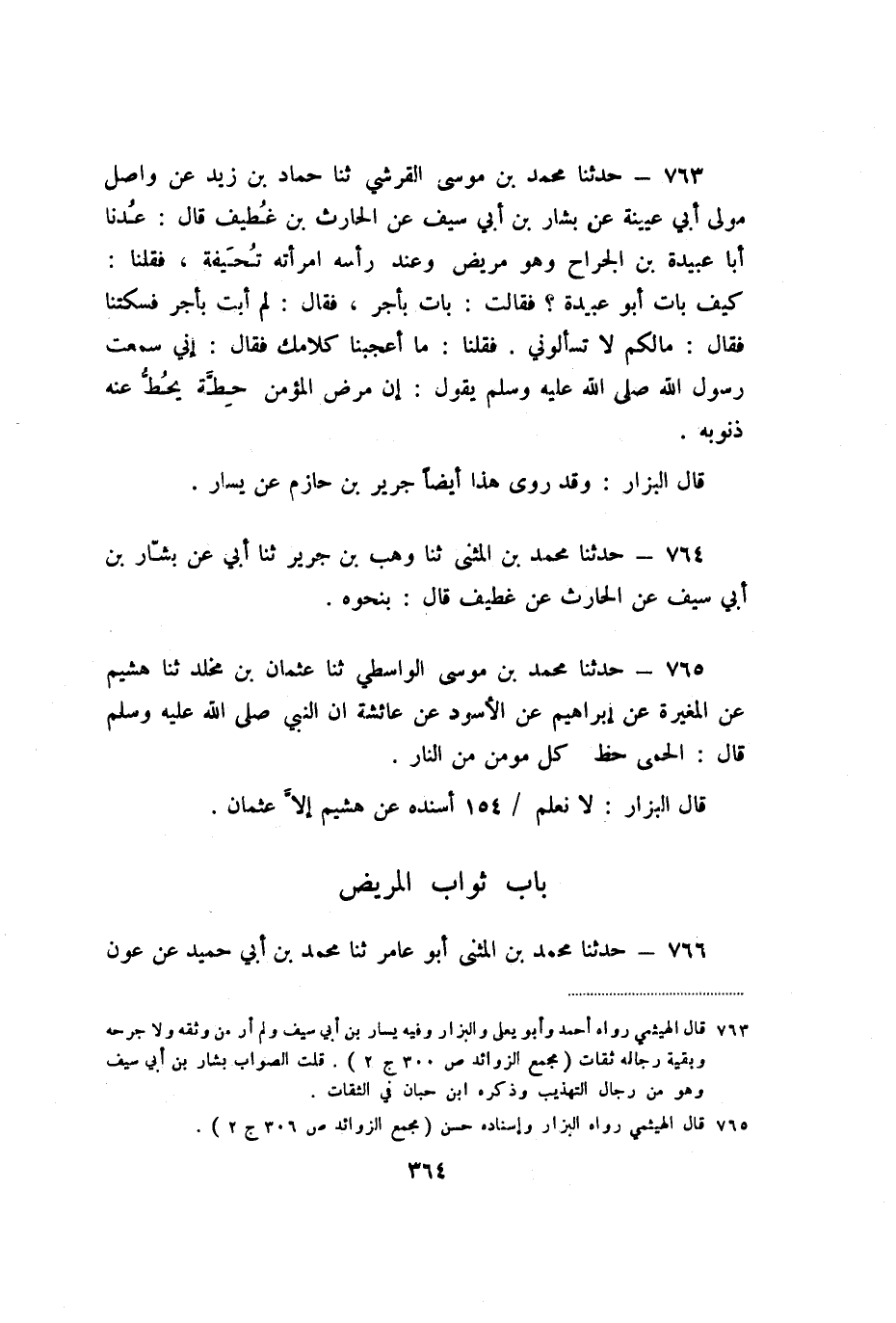763 - حَدَّثَنَا مُحَمَّدُ بْنُ مُوسَى الْقُرَشِيُّ، ثنا حَمَّادُ بْنُ زَيْدٍ، عَنْ وَاصِلٍ مَوْلَى أَبِي عُيَيْنَةَ، عَنْ بَشَّارِ بْنِ أَبِي سَيْفٍ، عَنِ الْحَارِثِ بْنِ غُطَيْفٍ، قَالَ: عُدْنَا أَبَا عُبَيْدَةَ الْجَرَّاحَ، وَهُوَ مَرِيضٌ، وَعِنْدَ رَأْسِهِ امْرَأَتُهُ تُحَيْفَةُ، فَقُلْنَا: كَيْفَ بَاتَ أَبُو عُبَيْدَةَ؟ فَقَالَتْ: بَاتَ بِأَجْرٍ، فَقَالَ: لَمْ أَبِتْ بِأَجْرٍ فَسَكَتْنَا، فَقَالَ: مَا لَكُمْ لا تَسْأَلُونِي؟ ، فَقُلْنَا: مَا أَعْجَبَنَا كَلامُكَ، فَقَالَ: إِنِّي سَمِعْتُ رَسُولَ اللَّهِ صَلَّى اللَّهُ عَلَيْهِ وَسَلَّمَ يَقُولُ: «إِنَّ مَرَضَ الْمُؤْمِنِ حِطَّةٌ يَحُطُّ عَنْهُ ذُنُوبَهُ» .