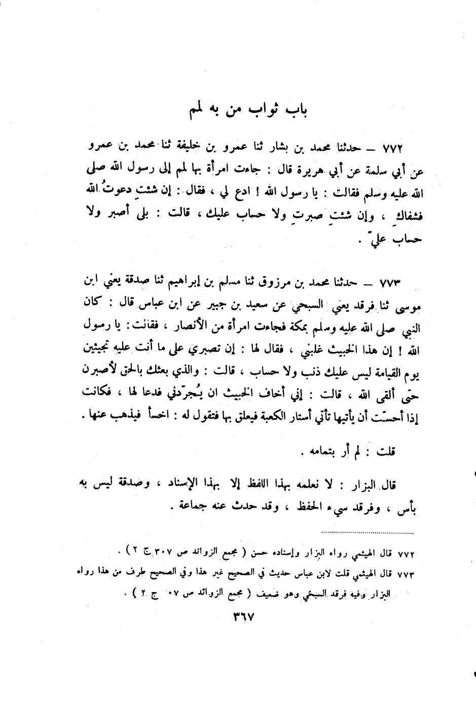 772 - حَدَّثَنَا مُحَمَّدُ بْنُ بَشَّارٍ، ثنا عَمْرُو بْنُ خَلِيفَةَ، ثنا مُحَمَّدُ بْنُ عَمْرٍو، عَنْ أَبِي سَلَمَةَ، عَنْ أَبِي هُرَيْرَةَ، قَالَ: جَاءَتِ امْرَأَةٌ بِهَا لَمَمٌ إِلَى رَسُولِ اللَّهِ صَلَّى اللَّهُ عَلَيْهِ وَسَلَّمَ فَقَالَتْ: يَا رَسُولَ اللَّهِ! ادْعُ لِي، فَقَالَ: «إِنْ شِئْتِ دَعَوْتُ اللَّهَ فَشَفَاكِ، وَإِنْ شِئْتِ صَبَرْتِ وَلا حِسَابَ عَلَيْكِ» ، قَالَتْ: بَلَى أَصْبِرُ وَلا حِسَابَ عَلَيَّ.