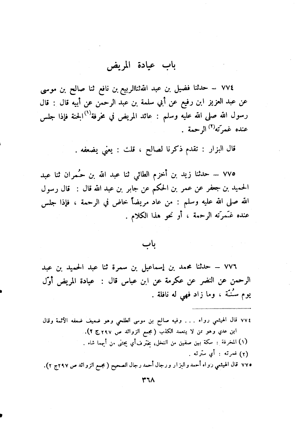774 - حَدَّثَنَا فُضَيْلُ بْنُ عَبْدِ اللَّهِ، ثنا الرَّبِيعُ بْنُ نَافِعٍ، ثنا صَالِحُ بْنُ مُوسَى، عَنْ عَبْدِ الْعَزِيزِ بْنِ رُفَيْعٍ، عَنْ أَبِي سَلَمَةَ بْنِ عَبْدِ الرَّحْمَنِ، عَنْ أَبِيهِ، قَالَ: قَالَ رَسُولُ اللَّهِ صَلَّى اللَّهُ عَلَيْهِ وَسَلَّمَ: «عَائِدُ الْمَرِيضِ فِي مَخْرَفَةِ الْجَنَّةِ، فَإِذَا جَلَسَ عِنْدَهَ غَمَرَتْهُ الرَّحْمَةُ» .