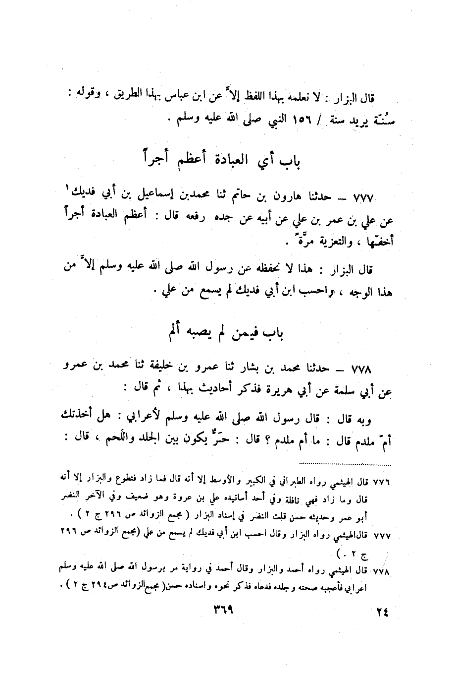 قَالَ الْبَزَّارُ: هَذَا لا نَحْفَظُهُ عَنْ رَسُولِ اللَّهِ صَلَّى اللَّهُ عَلَيْهِ وَسَلَّمَ إِلا مِنْ هَذَا الْوَجْهِ، وَأَحْسِبُ ابْنَ أَبِي فُدَيْكٍ لَمْ يَسْمَعْ مِنْ عَلِيٍّ.