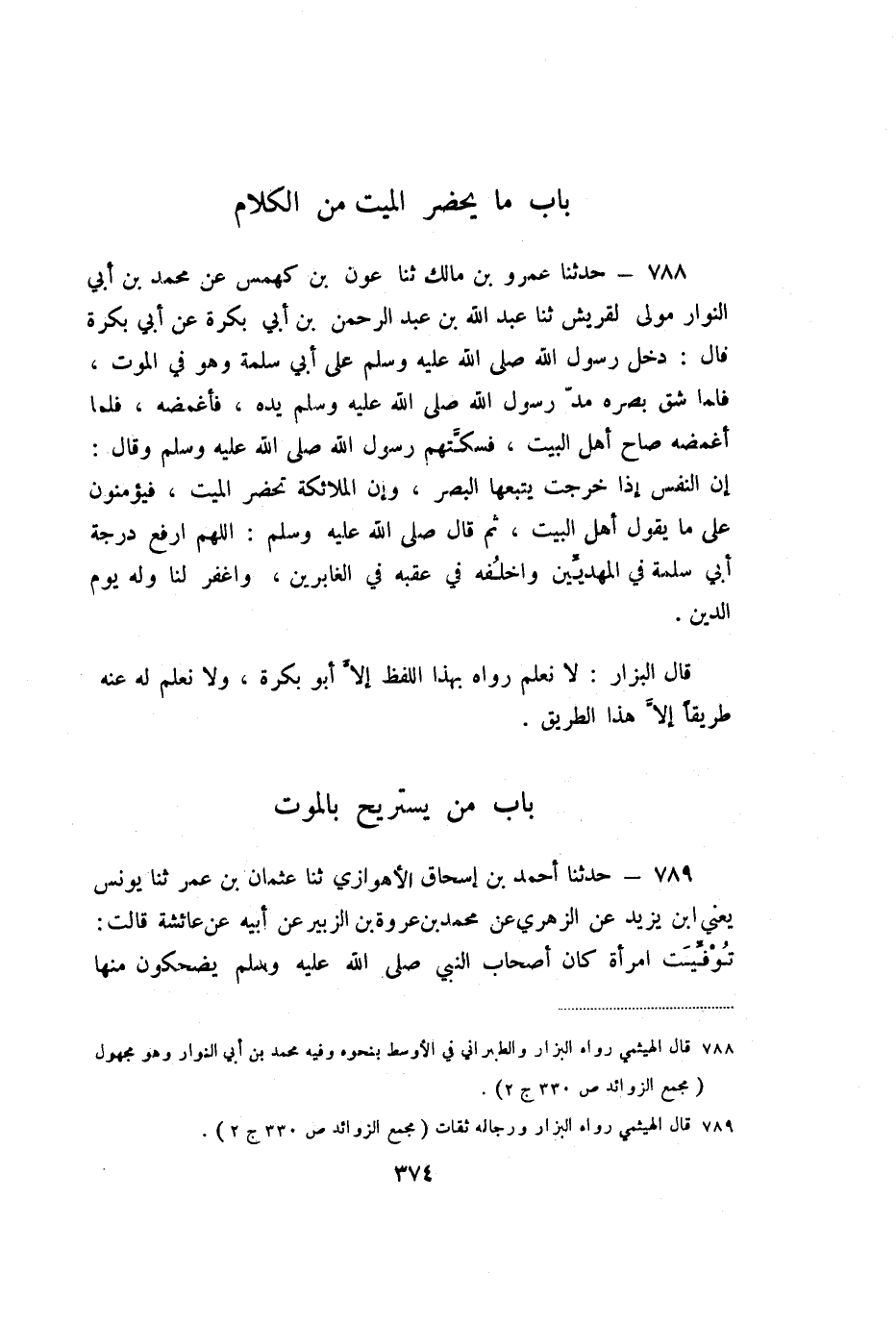 788 - حَدَّثَنَا عَمْرُو بْنُ مَالِكٍ، ثنا عَوْنُ بْنُ كَهْمَسٍ، عَنْ مُحَمَّدِ بْنِ أَبِي النَّوَّارِ مَوْلًى لِقُرَيْشٍ، ثنا عَبْدُ اللَّهِ بْنُ عَبْدِ الرَّحْمَنِ بْنِ أَبِي بَكْرَةَ، عَنْ أَبِي بَكْرَةَ، قَالَ: دَخَلَ رَسُولُ اللَّهِ صَلَّى اللَّهُ عَلَيْهِ وَسَلَّمَ عَلَى أَبِي سَلَمَةَ، وَهُوَ فِي الْمَوْتِ، فَلَمَّا شَقَّ بَصَرُهُ مَدَّ رَسُولُ اللَّهِ صَلَّى اللَّهُ عَلَيْهِ وَسَلَّمَ يَدَهُ، فَأَغْمَضَهُ، فَلَمَّا أَغْمَضَهُ صَاحَ أَهْلُ الْبَيْتِ، فَسَكَّتَهُمْ رَسُولُ اللَّهِ صَلَّى اللَّهُ عَلَيْهِ وَسَلَّمَ، وَقَالَ: «إِنَّ النَّفْسَ إِذَا خَرَجَتْ يَتْبَعُهَا الْبَصَرُ، وَإِنَّ الْمَلائِكَةَ تَحْضُرُ الْمَيِّتَ، فَيُؤَمِّنُونَ عَلَى مَا يَقُولُ أَهْلُ الْبَيْتِ» ، ثُمَّ قَالَ صَلَّى اللَّهُ عَلَيْهِ وَسَلَّمَ: «اللَّهُمَّ ارْفَعْ دَرَجَةَ أَبِي سَلَمَةَ فِي الْمَهْدِيِّينَ، وَاخْلُفْهُ فِي عَقِبِهِ فِي الْغَابِرِينَ، وَاغْفِرْ لَنَا وَلَهُ يَوْمَ الدِّينِ» .