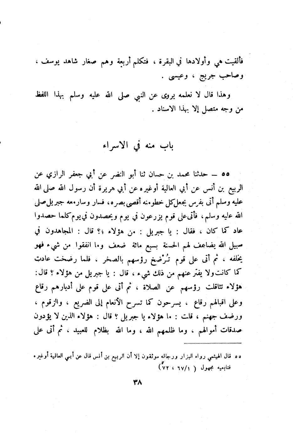 55 - حَدَّثَنَا مُحَمَّدُ بْنُ حَسَّانَ، ثنا أَبُو النَّضْرِ، عَنْ أَبِي جَعْفَرٍ الرَّازِيِّ، عَنِ الرَّبِيعِ بْنِ أَنَسٍ، عَنْ أَبِي الْعَالِيَةِ، أَوْ غَيْرِهِ، عَنْ أَبِي هُرَيْرَةَ، أَنَّ رَسُولَ اللَّهِ صَلَّى اللَّهُ عَلَيْهِ وَسَلَّمَ أُتِيَ بِفَرَسٍ يَجْعَلُ كُلَّ خَطْوٍ مِنْهُ أَقْصَى بَصَرِهِ، فَسَارَ وَسَارَ مَعَهُ جِبْرِيلُ صَلَّى اللَّهُ عَلَيْهِ وَسَلَّمَ، فَأَتَى عَلَى قَوْمٍ يَزْرَعُونَ فِي يَوْمٍ وَيَحْصُدُونَ فِي يَوْمٍ، كُلَّمَا حَصَدُوا عَادَ كَمَا كَانَ، فَقَالَ: يَا جِبْرِيلُ: مَنْ هَؤُلاءِ؟ قَالَ: الْمُجَاهِدُونَ فِي سَبِيلِ اللَّهِ يُضَاعَفُ لَهُمُ الْحَسَنَةُ بِسَبْعِ مِائَةِ ضِعْفٍ، وَمَا أَنْفَقُوا مِنْ شَيْءٍ فَهُوَ يَخْلُفُهُ، ثُمَّ أَتَى عَلَى قَوْمٍ تُرْضَخُ رُءُوسُهُمْ بِالصَّخْرِ، فَلَمَّا رُضِخَتْ عَادَتْ كَمَا كَانَتْ، وَلا يَفْتُرُ عَنْهُمْ مَنْ ذَلِكَ شَيْءٌ، قَالَ: يَا جِبْرِيلُ مَنْ هَؤُلاءِ؟ قَالَ: هَؤُلاءِ تَثَاقَلَتْ رُءُوسُهُمْ عَنِ الصَّلاةِ، ثُمَّ أَتَى عَلَى قَوْمٍ عَلَى أَدْبَارِهِمْ رِقَاعٌ، وَعَلَى أَقْبَالِهِمْ رِقَاعٌ، يَسْرَحُونَ كَمَا تَسْرَحُ الأَنْعَامُ إِلَى الضَّرِيعِ، وَالزَّقُّومِ، وَرِضْفِ جَهَنَّمَ، قُلْتُ: مَا هَؤُلاءِ يَا جِبْرِيلُ؟ قَالَ: هَؤُلاءِ الَّذِينَ لا يُؤَدُّونَ صَدَقَاتِ أَمْوَالِهِمْ، وَمَا ظَلَمَهُمُ اللَّهُ، وَمَا اللَّهُ بِظَلامٍ لِلْعَبِيدِ، ثُمَّ أَتَى عَلَى