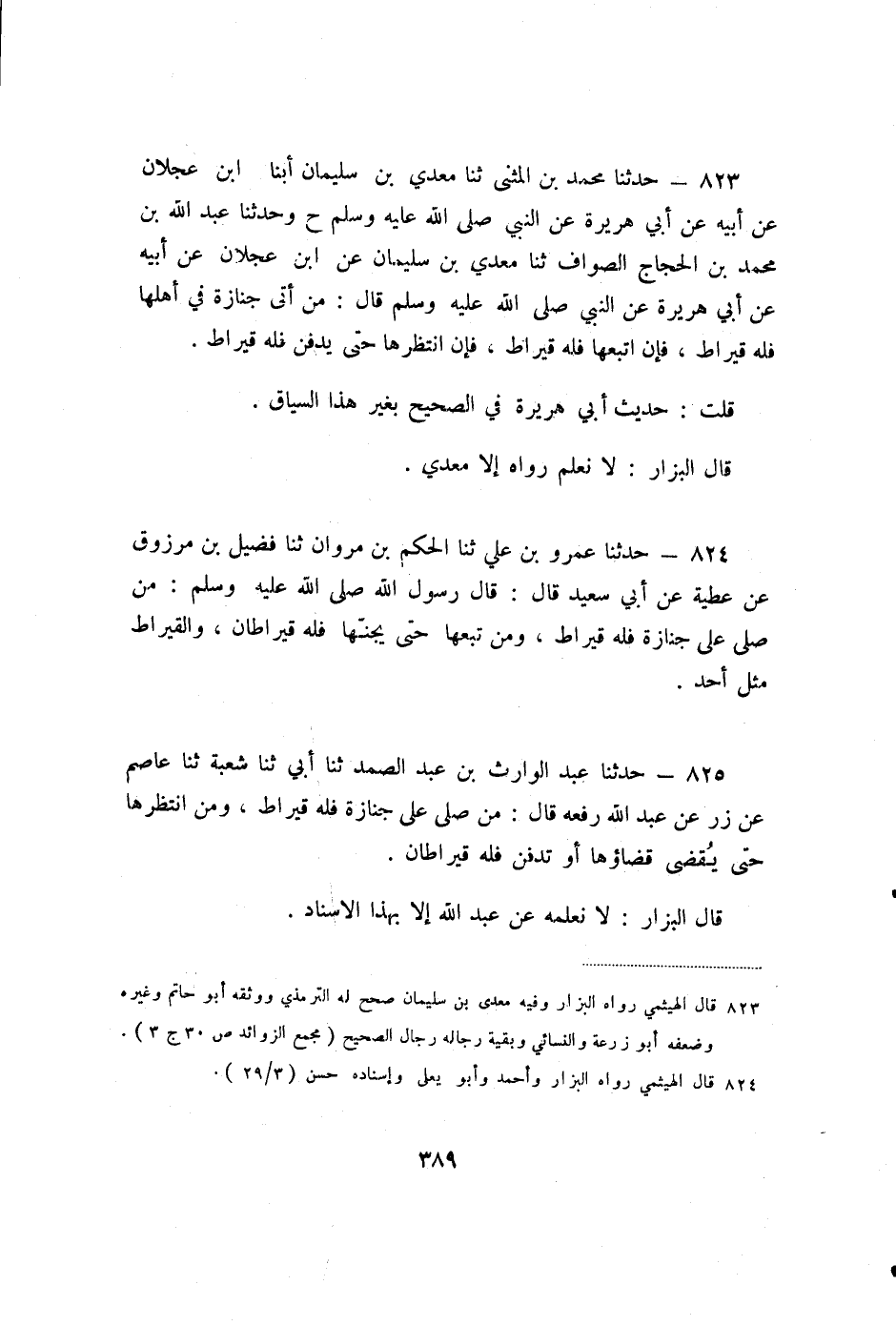 823 - حَدَّثَنَا مُحَمَّدُ بْنُ الْمُثَنَّى، ثنا مَعْدِيُّ بْنُ سُلَيْمَانَ، أنبا ابْنُ عَجْلانَ، عَنْ أَبِيهِ، عَنْ أَبِي هُرَيْرَة َ، عَنِ النَّبِيِّ صَلَّى اللَّهُ عَلَيْهِ وَسَلَّمَ، ح، وَحَدَّثَنَا عَبْدُ اللَّهِ بْنُ مُحَمَّدِ بْنِ الْحَجَّاجِ الصَّوَّافُ، ثنا مَعْدِيُّ بْنُ سُلَيْمَانَ، عَنِ ابْنِ عَجْلانَ، عَنْ أَبِيهِ، عَنْ أَبِي هُرَيْرَةَ، عَنِ النَّبِيِّ صَلَّى اللَّهُ عَلَيْهِ وَسَلَّمَ، قَالَ: «مَنْ أَتَى جِنَازَةً فِي أَهْلِهَا فَلَهُ قِيرَاطٌ، فَإِنِ اتَّبَعَهَا فَلَهُ قِيرَاطٌ، فَإِنِ انْتَظَرَهَا حَتَّى يُدْفَنَ فَلَهُ قِيرَاطٌ» .