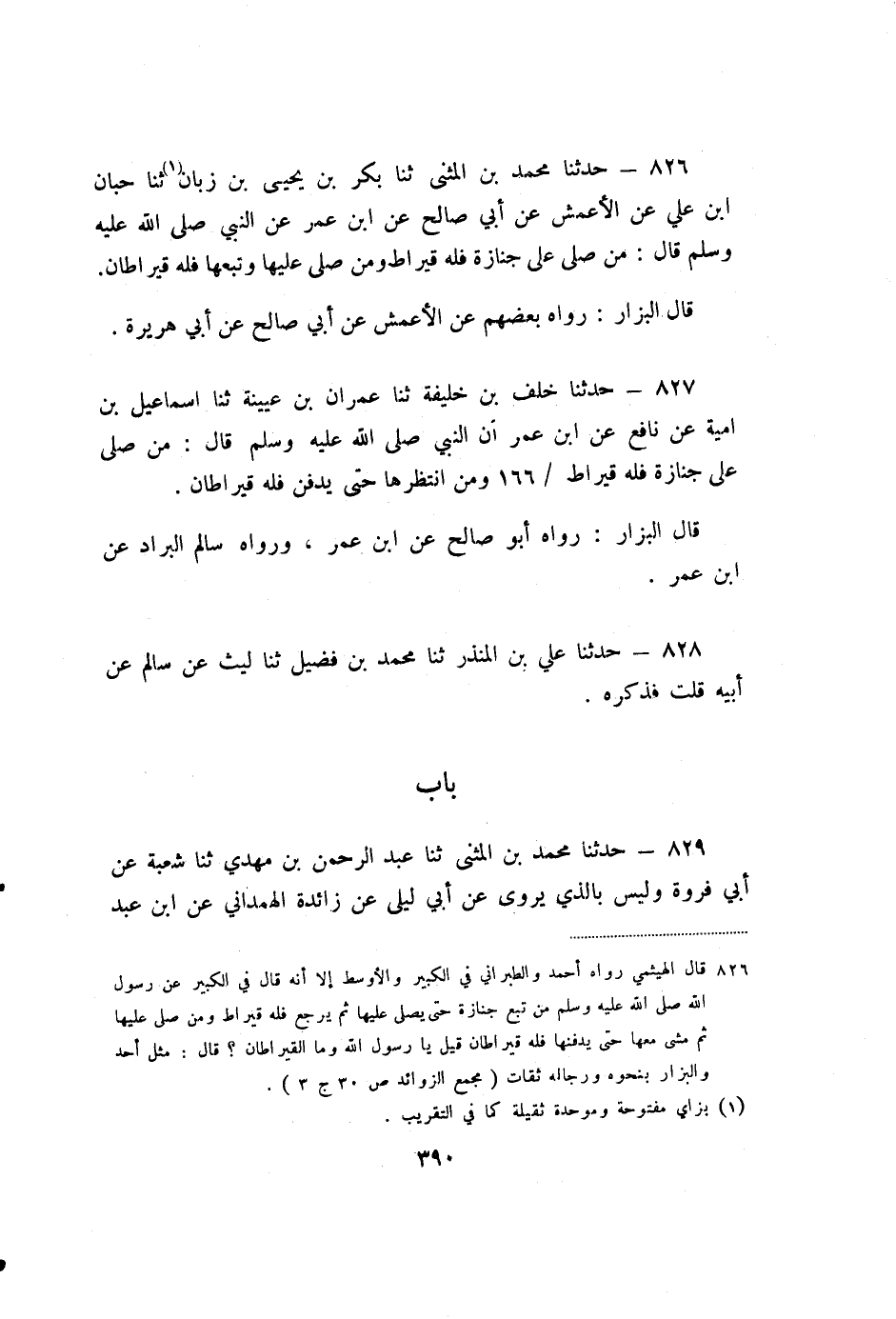 826 - حَدَّثَنَا مُحَمَّدُ بْنُ الْمُثَنَّى، ثنا بَكْرُ بْنُ يَحْيَى بْنِ زَبَانَ، ثنا حِبَّانُ بْنُ عَلِيٍّ، عَنِ الأَعْمَشِ، عَنْ أَبِي صَالِحٍ، عَنِ ابْنِ عُمَرَ، عَنِ النَّبِيِّ صَلَّى اللَّهُ عَلَيْهِ وَسَلَّمَ، قَالَ: «مَنْ صَلَّى عَلَى جِنَازَةٍ فَلَهُ قِيرَاطٌ، وَمَنْ صَلَّى عَلَيْهَا وَتَبِعَهَا فَلَهُ قِيرَاطَانِ» .