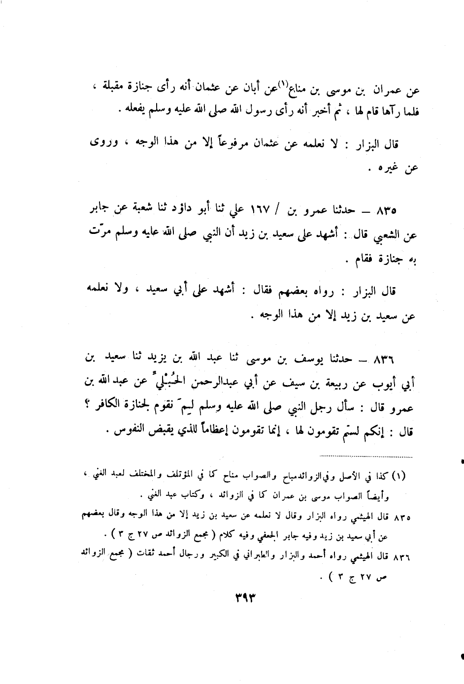 835 - حَدَّثَنَا عَمْرُو بْنُ عَلِيٍّ، ثنا أَبُو دَاوُدَ، ثنا شُعْبَةُ، عَنْ جَابِرٍ، عَنِ الشَّعْبِيِّ، قَالَ: أَشْهَدُ عَلَى سَعِيدِ بْنِ زَيْدٍ، أَنَّ النَّبِيَّ صَلَّى اللَّهُ عَلَيْهِ وَسَلَّمَ مَرَّتْ بِهِ جِنَازَةٌ فَقَامَ.
