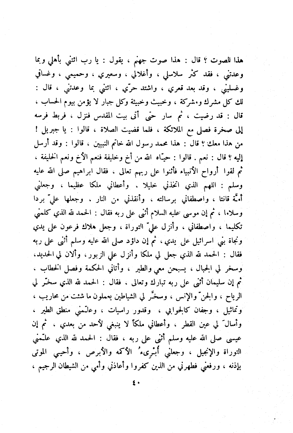 هَذَا الصَّوْتُ؟ قَالَ: هَذَا صَوْتُ جَهَنَّمَ، يَقُولُ: يَا رَبِّ ائْتِنِي بِأَهْلِي وَبِمَا وَعَدْتَنِي، فَقَدْ كَثُرَ سَلاسِلِي، وَأَغْلالِي، وَسَعِيرِي، وَحَمِيمِي، وَغَسَّاقِي وَغِسْلِينِي، وَقَدْ بَعُدَ قَعْرِي، وَاشْتَدَّ حَرِّي، ائْتِنِي بِمَا وَعَدْتَنِي، قَالَ: لَكِ كُلُّ مُشْرِكٍ وَمُشْرِكَةٍ، وَخَبِيثٍ وَخَبِيثَةٍ، وَكُلُّ جَبَّارٍ لا يُؤْمِنُ بِيَوْمِ الْحِسَابِ، قَالَ: قَدْ رَضِيتُ، ثُمَّ سَارَ حَتَّى أَتَى بَيْتَ الْمَقْدِسِ فَنَزَلَ، فَرَبَطَ فَرَسَهُ إِلَى صَخْرَةٍ فَصَلَّى مَعَ الْمَلائِكَةِ، فَلَمَّا قُضِيَتِ الصَّلاةُ، قَالُوا: يَا جِبْرِيلُ! مَنْ هَذَا مَعَكَ؟ قَالَ: هَذَا مُحَمَّدٌ رَسُولُ اللَّهِ خَاتَمُ النَّبِيِّينَ، قَالُوا: وَقَدْ أُرْسِلَ إِلَيْهِ؟ قَالَ: نَعَمْ، قَالُوا: حَيَّاهُ اللَّهُ مِنْ أَخٍ وَخَلِيفَةٍ، فَنِعْمَ الأَخُ وَنِعْمَ الْخَلِيفَةُ، ثُمَّ لَقُوا أَرْوَاحَ الأَنْبِيَاءِ فَأَثْنَوْا عَلَى رَبِّهِمْ تَعَالَى، فَقَالَ إِبْرَاهِيمُ صَلَّى اللَّهُ عَلَيْهِ وَسَلَّمَ: اللَّهُمَّ الَّذِي اتَّخَذَنِي خَلِيلا، وَأَعْطَانِي مُلْكًا عَظِيمًا، وَجَعَلَنِي أُمَّةً قَانِتًا، وَاصْطَفَانِي بِرِسَالَتِهِ، وَأَنْقَذَنِي مِنَ النَّارِ، وَجَعَلَهَا عَلَيَّ بَرْدًا وَسَلامًا، ثُمَّ إِنَّ مُوسَى عَلَيْهِ السَّلامُ أَثْنَى عَلَى رَبِّهِ، فَقَالَ: الْحَمْدُ لِلَّهِ الَّذِي كَلَّمَنِي تَكْلِيمًا، وَاصْطَفَانِي، وَأَنْزَلَ عَلَيَّ التَّوْرَاةَ، وَجَعَلَ هَلاكَ فِرْعَوْنَ عَلَى يَدَيَّ وَنَجَاةَ بَنِي إِسْرَائِيلَ عَلَى يَدَيَّ، ثُمَّ إِنَّ دَاوُدَ صَلَّى اللَّهُ عَلَيْهِ وَسَلَّمَ أَثْنَى عَلَى رَبِّهِ، فَقَالَ: الْحَمْدُ لِلَّهِ الَّذِي جَعَلَ لِي مُلْكًا وَأَنْزَلَ عَلَيَّ الزَّبُورَ، وَأَلانَ لِي الْحَدِيدَ، وَسَخَّرَ لِي الْجِبَالَ، يُسَبِّحْنَ مَعِي وَالطَّيْرُ، وَأَتَانِي الْحِكْمَةَ وَفَصْلَ الْخِطَابِ، ثُمَّ إِنَّ سُلَيْمَانَ أَثْنَى عَلَى رَبِّهِ تَبَارَكَ وَتَعَالَى، فَقَالَ: الْحَمْدُ لِلَّهِ الَّذِي سَخَّرَ لِي الرِّيَاحَ، وَالْجِنَّ وَالإِنْسَ، وَسَخَّرَ لِي الشَّيَاطِينَ يَعْمَلُونَ مَا شِئْتُ مِنْ مَحَارِيبَ، وَتَمَاثِيلَ، وَجِفَانٍ كَالْجَوَابِي، وَقُدُورٍ رَاسِيَاتٍ، وَعَلَّمَنِي مَنْطِقَ الطَّيْرِ، وَأَسَالَ لِي عَيْنَ الْقِطْرِ، وَأَعْطَانِي مُلْكًا لا يَنْبَغِي لأَحَدٍ مِنْ بَعْدِي، ثُمَّ إِنَّ عِيسَى صَلَّى اللَّهُ عَلَيْهِ وَسَلَّمَ أَثْنَى عَلَى رَبِّهِ، فَقَالَ: الْحَمْدُ لِلَّهِ الَّذِي عَلَّمَنِي التَّوْرَاةَ وَالإِنْجِيلَ، وَجَعَلَنِي أُبْرِئُ الأَكْمَهَ وَالأَبْرَصَ، وَأُحْيِي الْمَوْتَى بِإِذْنِهِ، وَرَفَعَنِي فَطَهَّرَنِي مِنَ الَّذِينَ كَفَرُوا، وَأَعَاذَنِي وَأُمِّي مِنَ الشَّيْطَانِ الرَّجِيمِ،
