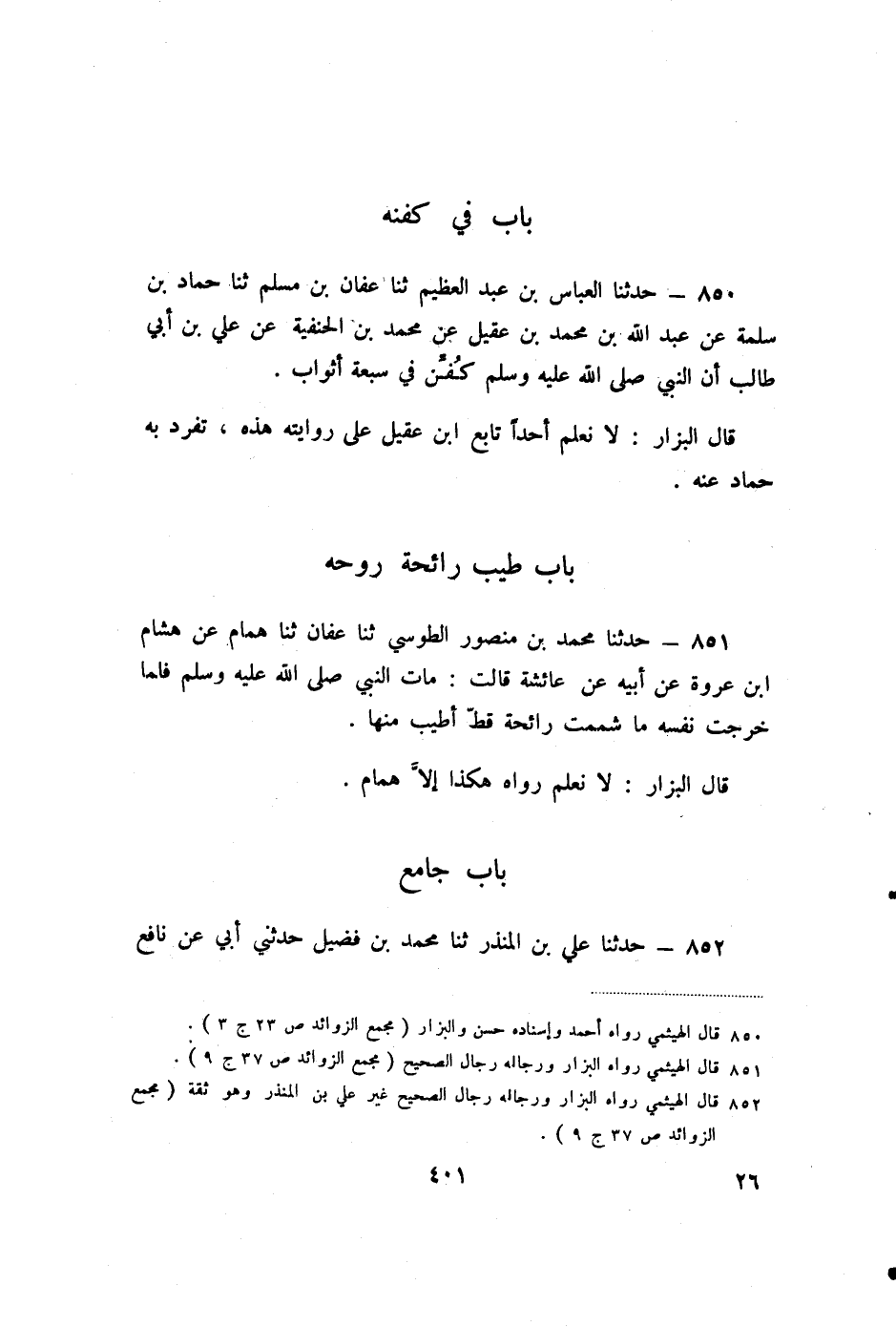 850 - حَدَّثَنَا الْعَبَّاسُ بْنُ عَبْدِ الْعَظِيمِ، ثنا عَفَّانُ بْنُ مُسْلِمٍ، ثنا حَمَّادُ بْنُ سَلَمَةَ، عَنْ عَبْدِ اللَّهِ بْنِ مُحَمَّدِ بْنِ عَقِيلٍ، عَنْ مُحَمَّدِ بْنِ الْحَنَفِيَّةِ، عَنْ عَلِيِّ بْنِ أَبِي طَالِبٍ، أَنَّ النَّبِيَّ صَلَّى اللَّهُ عَلَيْهِ وَسَلَّمَ «كُفِّنَ فِي سَبْعَةِ أَثْوَابٍ» .