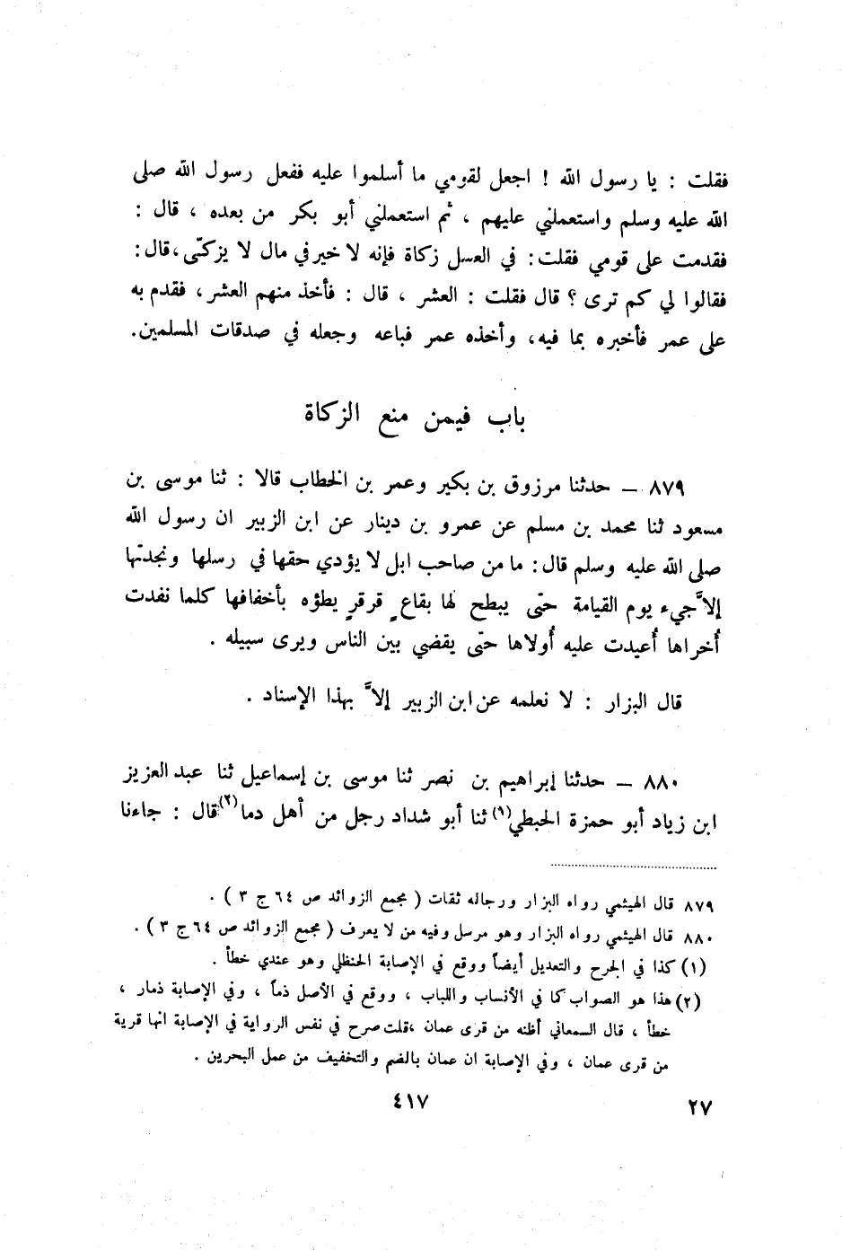 879 - حَدَّثَنَا مَرْزُوقُ بْنُ بُكَيْرٍ، وَعُمَرُ بْنُ الْخَطَّابِ، قَالا: ثنا مُوسَى بْنُ مَسْعُودٍ، ثنا مُحَمَّدُ بْنُ مُسْلِمٍ، عَنْ عَمْرِو بْنِ دِينَارٍ، عَنِ ابْنِ الزُّبَيْرِ، أَنَّ رَسُولَ اللَّهِ صَلَّى اللَّهُ عَلَيْهِ وَسَلَّمَ قَالَ: «مَا مِنْ صَاحِبِ إِبِلٍ لا يُؤَدِّي حَقَّهَا فِي رِسْلِهَا وَنَجْدَتِهَا إِلا جِيءَ يَوْمَ الْقِيَامَةِ حَتَّى يُبْطَحَ لَهَا بِقَاعٍ قَرْقَرٍ تَطَؤُهُ بِأَخْفَافِهَا، كُلَّمَا نَفِدَتْ أُخْرَاهَا أُعِيدَتْ عَلَيْهِ أُولاهَا حَتَّى يُقْضَى بَيْنَ النَّاسِ وَيُرَى سَبِيلَهُ» .