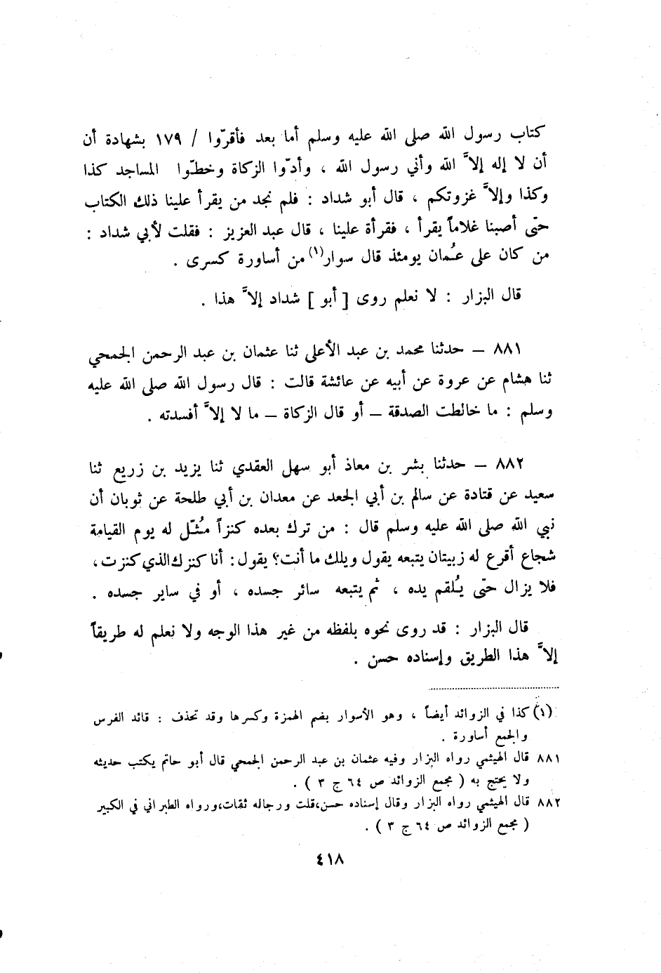 كِتَابُ رَسُولِ اللَّهِ صَلَّى اللَّهُ عَلَيْهِ وَسَلَّمَ: «أَمَّا بَعْدَ فَأَقِرُّوا بِشَهَادَةِ أَنْ لا إِلَهَ إِلا اللَّهُ وَأَنِّي رَسُولُ اللَّهِ، وَأَدُّوا الزَّكَاةَ، وَخُطُّوا الْمَسَاجِدَ كَذَا وَكَذَا وَإِلا غَزَوْتُكُمْ» ، قَالَ أَبُو شَدَّادٍ: فَلَمْ نَجِدْ مَنْ يَقْرَأُ عَلَيْنَا ذَلِكَ الْكِتَابَ حَتَّى أَصَبْنَا غُلامًا يَقْرَأُ، فَقَرَأَهُ؟ عَلَيْنَا، قَالَ عَبْدُ الْعَزِيزِ: فَقُلْتُ لأَبِي شَدَّادٍ: مَنْ كَانَ عَلَى عُمَانَ يَوْمَئِذٍ؟ ، قَالَ: سُوَارٌ مِنْ أَسَاوِرَةِ كِسْرَى.