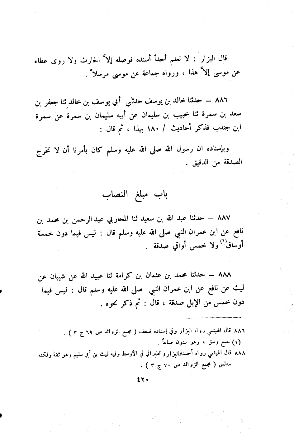 888 - حَدَّثَنَا مُحَمَّدُ بْنُ عُثْمَانَ بْنِ كَرَامَةَ، ثنا عُبَيْدُ اللَّهِ، عَنْ شَيْبَانَ، عَنْ لَيْثٍ، عَنْ نَافِعٍ، عَنِ ابْنِ عِمْرَانَ، أَنَّ النَّبِيَّ صَلَّى اللَّهُ عَلَيْهِ وَسَلَّمَ قَالَ: «لَيْسَ فِيمَا دُونَ خَمْسٍ مِنَ الإِبِلِ صَدَقَةٌ» ، قَالَ: ثُمَّ ذَكَرَ نَحْوَهُ.