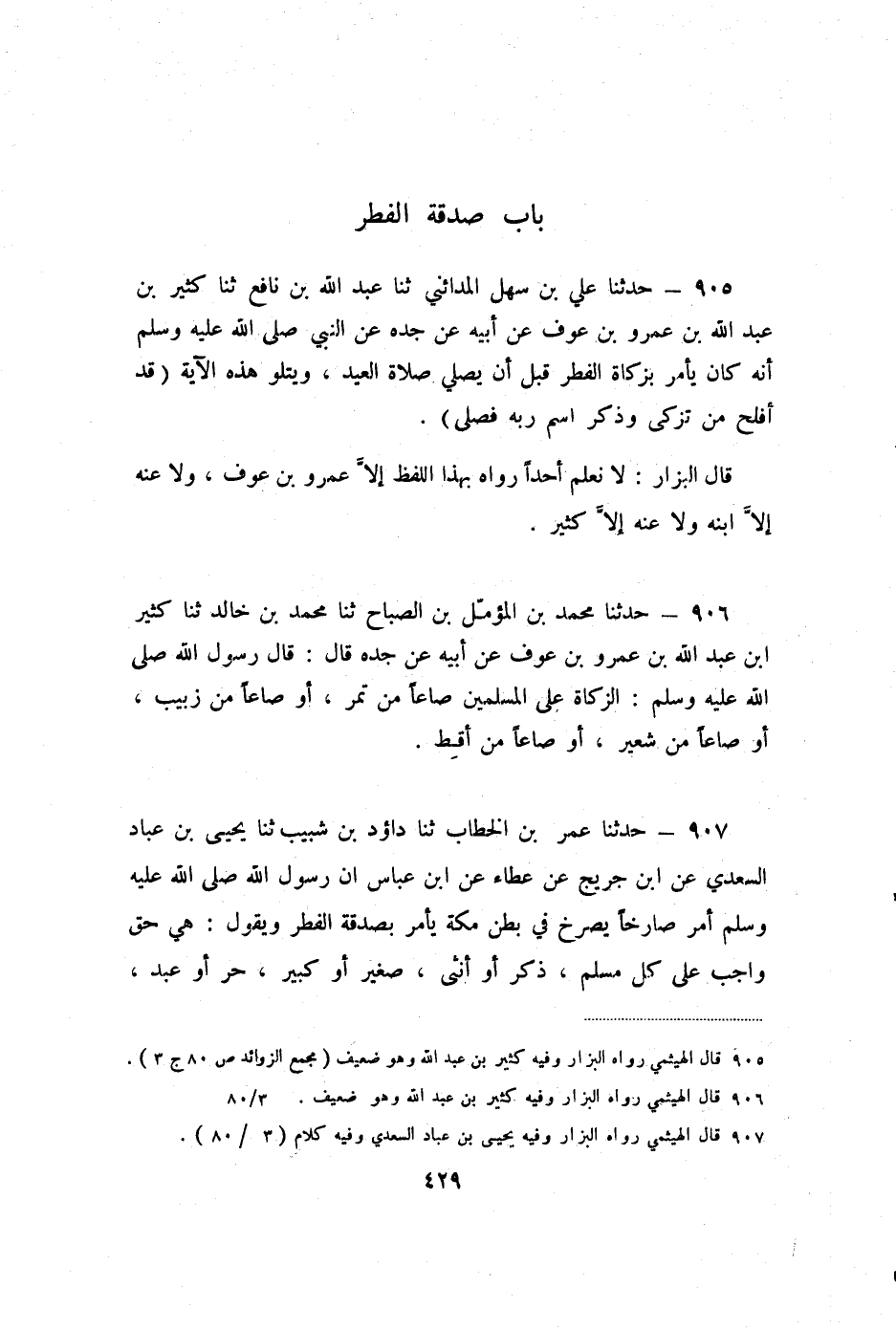 906 - حَدَّثَنَا مُحَمَّدُ بْنُ الْمُؤَمَّلِ بْنِ الصَّبَّاحِ، ثنا مُحَمَّدُ بْنُ خَالِدٍ، ثنا كَثِيرُ بْنُ عَبْدِ اللَّهِ بْنِ عَمْرِو بْنِ عَوْفٍ، عَنْ أَبِيهِ، عَنْ جَدِّهِ، قَالَ: قَالَ رَسُولُ اللَّهِ صَلَّى اللَّهُ عَلَيْهِ وَسَلَّمَ: «الزَّكَاةُ عَلَى الْمُسْلِمِينَ صَاعًا مِنْ تَمْرٍ، أَوْ صَاعًا مِنْ زَبِيبٍ، أَوْ صَاعًا مِنْ شَعِيرٍ، أَوْ صَاعًا مِنْ أَقِطٍ» .