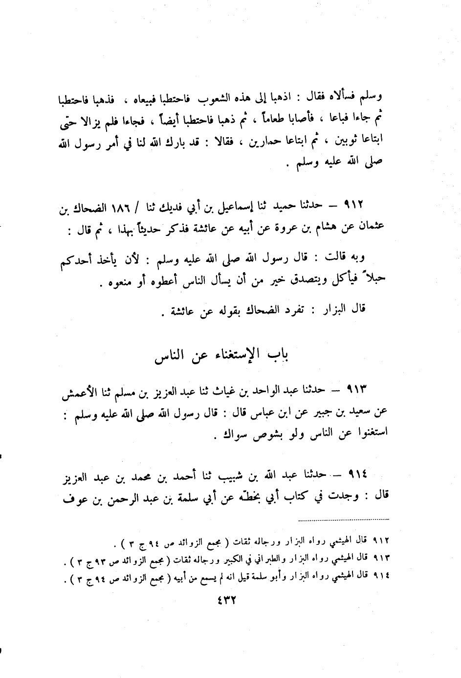 913 - حَدَّثَنَا عَبْدُ الْوَاحِدِ بْنُ غِيَاثٍ، ثنا عَبْدُ الْعَزِيزِ بْنُ مُسْلِمٍ، ثنا الأَعْمَشُ، عَنْ سَعِيدِ بْنِ جُبَيْرٍ، عَنِ ابْنِ عَبَّاسٍ، قَالَ: قَالَ رَسُولُ اللَّهِ صَلَّى اللَّهُ عَلَيْهِ وَسَلَّمَ: «اسْتَغْنُوا عَنِ النَّاسِ وَلَوْ بِشَوْصِ سِوَاكٍ» .