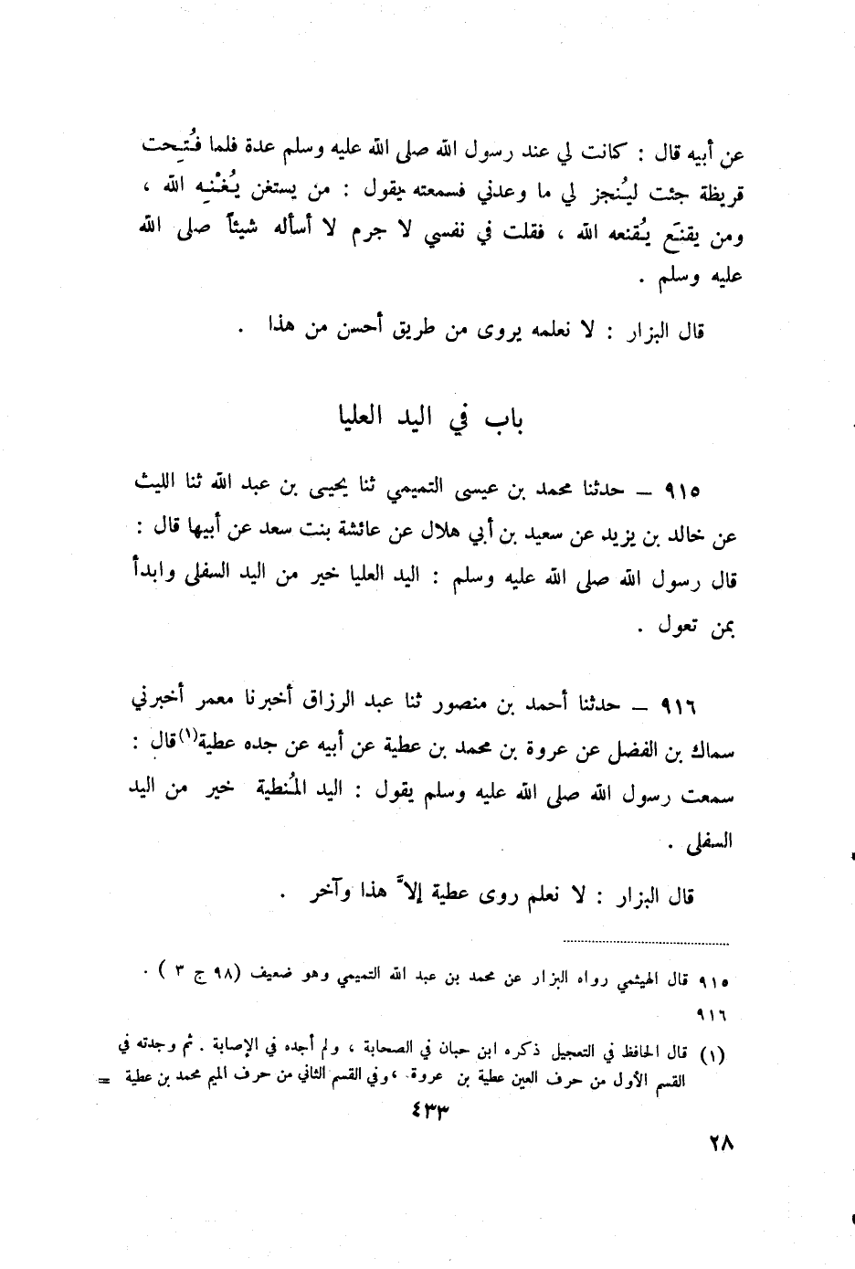 915 - حَدَّثَنَا مُحَمَّدُ بْنُ عِيسَى التَّمِيمِيُّ، ثنا يَحْيَى بْنُ عَبْدِ اللَّهِ، ثنا اللَّيْثُ، عَنْ خَالِدِ بْنِ يَزِيدَ، عَنْ سَعِيدِ بْنِ أَبِي هِلالٍ، عَنْ عَائِشَةَ بِنْتِ سَعْدٍ، عَنْ أَبِيهَا، قَالَ: قَالَ رَسُولُ اللَّهِ صَلَّى اللَّهُ عَلَيْهِ وَسَلَّمَ: «الْيَدُ الْعُلْيَا خَيْرٌ مِنَ الْيَدِ السُّفْلَى، وَابْدَأْ بِمَنْ تَعُولُ» .