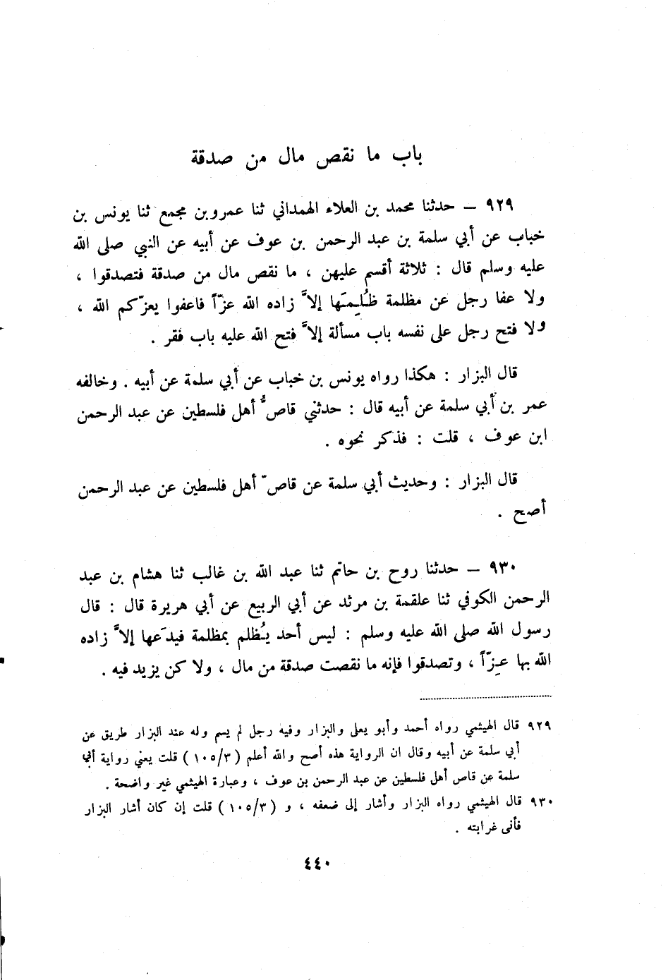929 - حَدَّثَنَا مُحَمَّدُ بْنُ الْعَلاءِ الْهَمْدَانِيُّ، ثنا عَمْرُو بْنُ مُجَمِّعٍ، ثنا يُونُسُ بْنُ خَبَّابٍ، عَنْ أَبِي سَلَمَةَ بْنِ عَبْدِ الرَّحْمَنِ بْنِ عَوْفٍ، عَنْ أَبِيهِ، عَنِ النَّبِيِّ صَلَّى اللَّهُ عَلَيْهِ وَسَلَّمَ، قَالَ: " ثَلاثَةٌ أُقْسِمُ عَلَيْهِنَّ: مَا نَقَصَ مَالٌ مِنْ صَدَقَةٍ فَتَصَدَّقُوا، وَلا عَفَا رَجُلٌ عَنْ مَظْلَمَةٍ ظُلِمَهَا إِلا زَادَهُ اللَّهُ عِزًّا، فَاعْفُوا يُعِزَّكُمُ اللَّهُ، وَلا فَتَحَ رَجُلٌ عَلَى نَفْسِهِ بَابَ مَسْأَلَةٍ إِلا فَتَحَ اللَّهُ عَلَيْهِ بَابَ فَقْرٍ ".