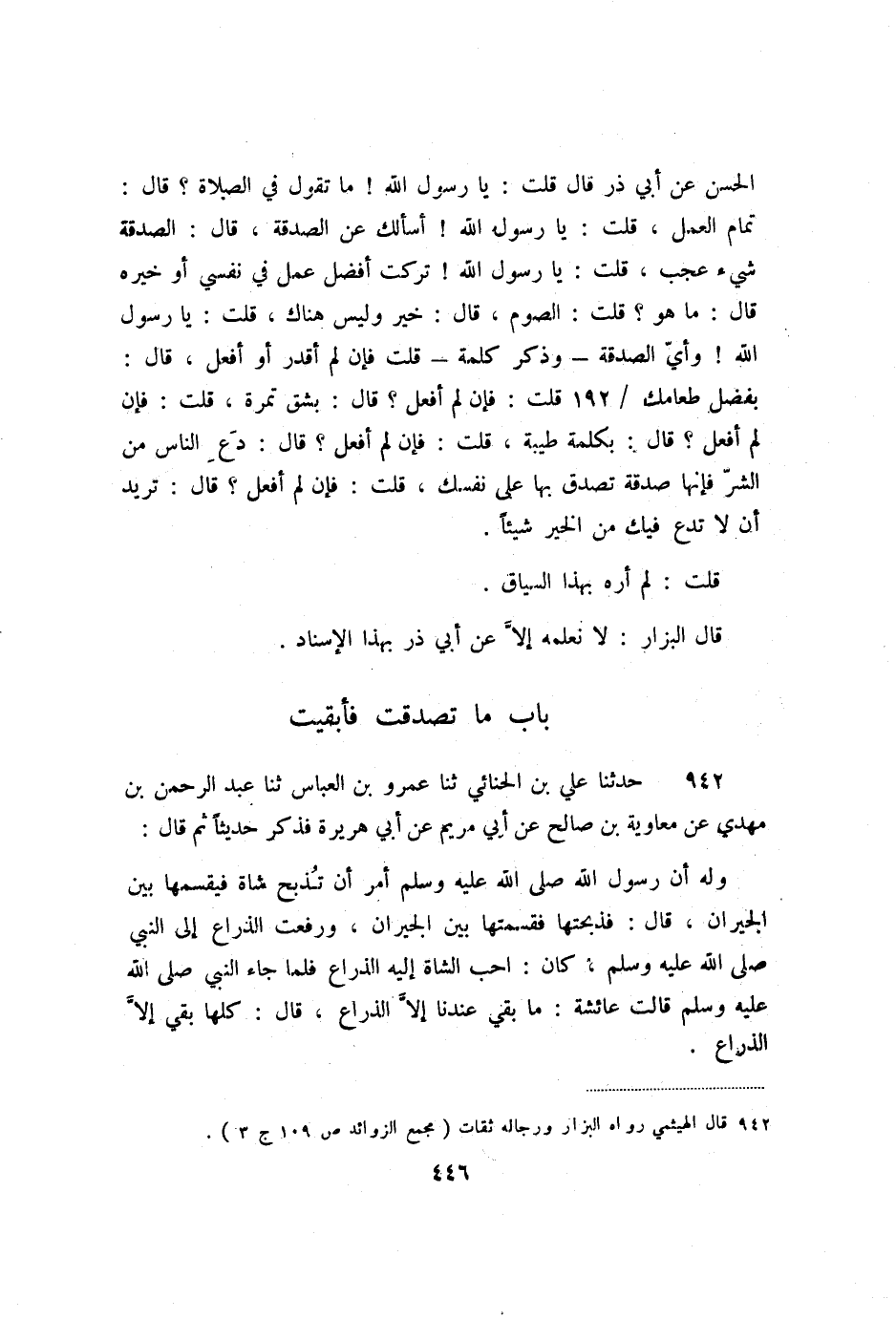 الْحَسَنِ، عَنْ أَبِي ذَرٍّ، قَالَ: قُلْتُ: يَا رَسُولَ اللَّهِ! مَا تَقُولُ فِي الصَّلاةِ؟ قَالَ: «تَمَامُ الْعَمَلِ» ، قُلْتُ: يَا رَسُولَ اللَّهِ! أَسْأَلُكَ عَنِ الصَّدَقَةِ، قَالَ: «الصَّدَقَةُ شَيْءٌ عَجَبٌ» ، قُلْتُ: يَا رَسُولَ اللَّهِ! تَرَكْتُ أَفْضَلَ عَمَلٍ فِي نَفْسِي أَوْ خَيْرَهُ، قَالَ: «مَا هُوَ؟» ، قُلْتُ: الصَّوْمُ، قَالَ: «خَيْرٌ وَلَيْسَ هُنَاكَ» ، قُلْتُ: يَا رَسُولَ اللَّهِ! وَأَيُّ الصَّدَقَةِ وَذَكَرَ كَلِمَةً، قُلْتُ: فَإِنْ لَمْ أَقْدِرْ أَوْ أَفْعَلْ، قَالَ: «بِفَضْلِ طَعَامِكَ» ، قُلْتُ: فَإِنْ لَمْ أَفْعَلْ؟ قَالَ: «بِشِقِّ تَمْرَةٍ» ، قُلْتُ: فَإِنْ لَمْ أَفْعَلْ؟ قَالَ: «بِكَلِمَةٍ طَيِّبَةٍ» ، قُلْتُ: فَإِنْ لَمْ أَفْعَلْ؟ قَالَ: «دَعِ النَّاسَ مِنَ الشَّرِّ فَإِنَّهَا صَدَقَةٌ تَصَدَّقُ بِهَا عَلَى نَفْسِكَ» ، قُلْتُ: فَإِنْ لَمْ أَفْعَلْ؟ قَالَ: «تُرِيدُ أَنْ لا تَدَعَ فِيكَ مِنَ الْخَيْرِ شَيْئًا» .
