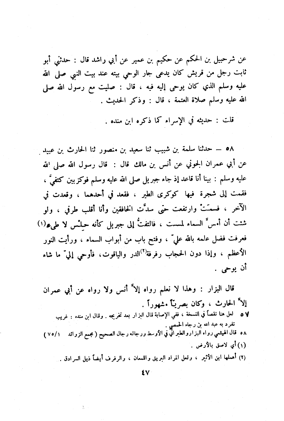 58 - حَدَّثَنَا سَلَمَةُ بْنُ شَبِيبٍ، ثنا سَعِيدُ بْنُ مَنْصُورٍ، ثنا الْحَارِثُ بْنُ عُبَيْدٍ، عَنْ أَبِي عِمْرَانَ الْجَوْنِيِّ، عَنْ أَنَسِ بْنِ مَالِكٍ، قَالَ: قَالَ رَسُولُ اللَّهِ صَلَّى اللَّهُ عَلَيْهِ وَسَلَّمَ: «بَيْنَا أَنَا قَاعِدٌ إِذْ جَاءَ جِبْرِيلُ صَلَّى اللَّهُ عَلَيْهِ وَسَلَّمَ، فَوَكَزَ بَيْنَ كَتِفَيَّ، فَقُمْتُ إِلَى شَجَرَةٍ فِيهَا كَوَكْرَيِ الطَّيْرِ، فَقَعَدَ فِي أَحَدِهِمَا، وَقَعَدْتُ فِي الآخَرِ، فَسَمَتْ وَارْتَفَعَتْ حَتَّى سَدَّتِ الْخَافِقَيْنِ، وَأَنَا أُقَلِّبُ طَرْفِي، وَلَوْ شِئْتُ أَنْ أَمَسَّ السَّمَاءَ لَمَسَسْتُ، فَالْتَفَتُّ إِلَى جِبْرِيلَ كَأَنَّهُ حِلْسٌ لاطِئٌ، فَعَرَفْتُ فَضْلَ عِلْمِهِ بِاللَّهِ عَلَيَّ، وَفُتِحَ بَابٌ مِنْ أَبْوَابِ السَّمَاءِ، وَرَأَيْتُ النُّورَ الأَعْظَمَ، وَإِذَا دُونَ الْحِجَابِ رَفْرَفَةُ الدُّرِّ وَالْيَاقُوتِ، فَأُوحِيَ إِلَيَّ مَا شَاءَ أَنْ يُوحَى» .
