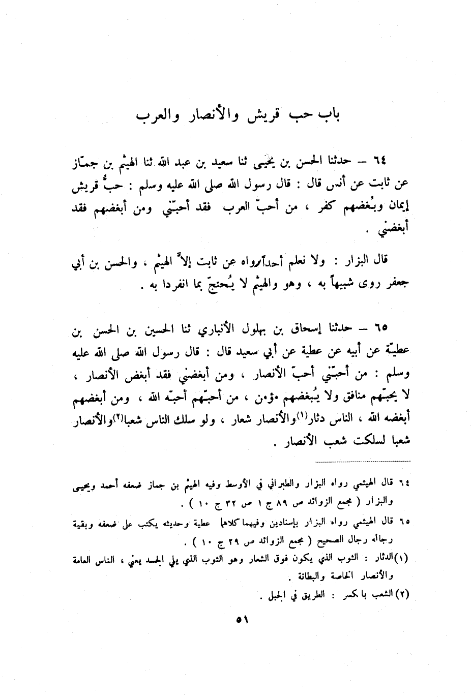 65 - حَدَّثَنَا إِسْحَاقُ بْنُ بُهْلُولٍ الأَنْبَارِيُّ، ثنا الْحُسَيْنُ بْنُ الْحَسَنِ بْنِ عَطِيَّةَ، عَنْ أَبِيهِ، عَنْ عَطِيَّةَ، عَنْ أَبِي سَعِيدٍ، قَالَ: قَالَ رَسُولُ اللَّهِ صَلَّى اللَّهُ عَلَيْهِ وَسَلَّمَ: «مَنْ أَحَبَّنِي أَحَبَّ الأَنْصَارِ، وَمَنْ أَبْغَضَنِي فَقَدْ أَبْغَضَ الأَنْصَارَ، لا يُحِبُّهُمْ مُنَافِقٌ، وَلا يُبْغِضُهُمْ مُؤْمِنٌ، مَنْ أَحَبَّهُمْ أَحَبَّهُ اللَّهُ، وَمَنْ أَبْغَضَهُمْ أَبْغَضَهُ اللَّهُ، النَّاسُ دِثَارٌ وَالأَنْصَارُ شِعَارٌ، وَلَوْ سَلَكَ النَّاسُ شِعْبًا وَالأَنْصَارُ شِعْبًا لَسَلَكْتُ شِعْبَ الأَنْصَارِ» .