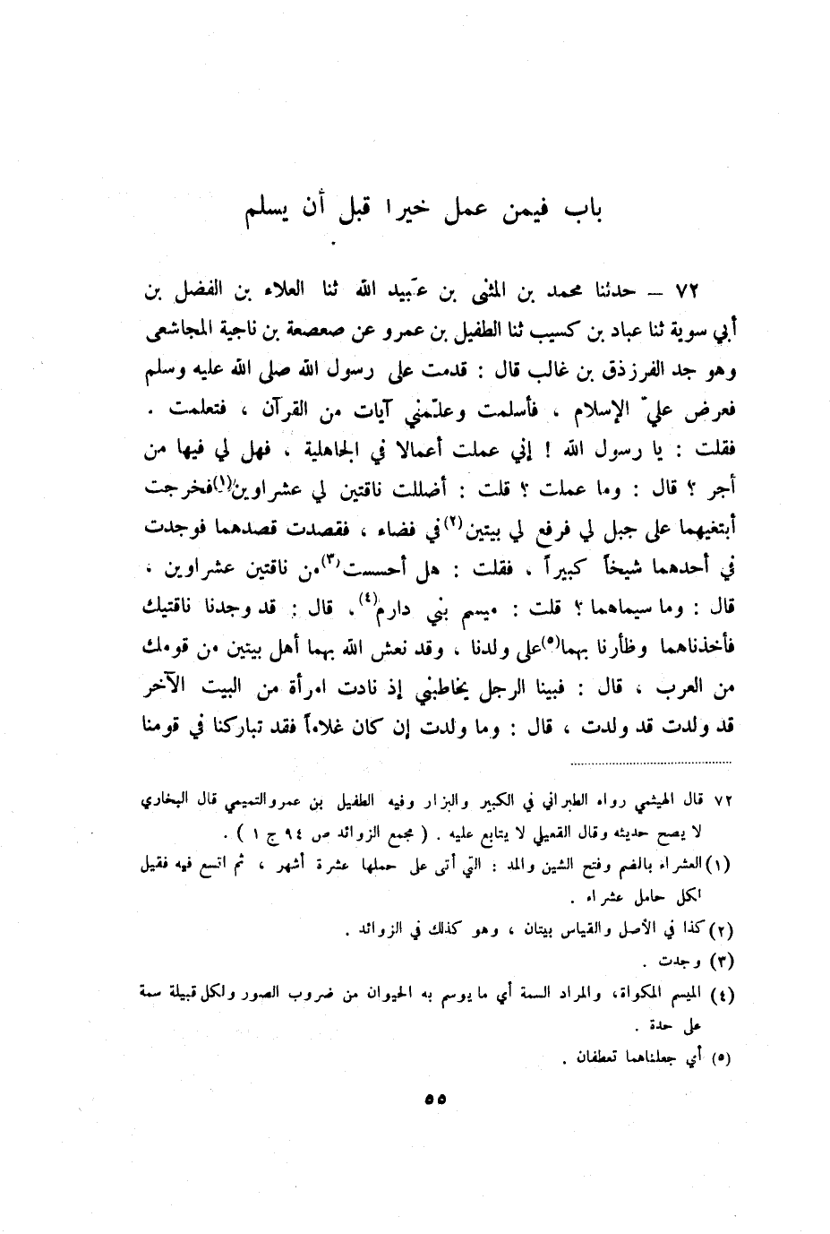 72 - حَدَّثَنَا مُحَمَّدُ بْنُ الْمُثَنَّى بْنِ عُبَيْدِ اللَّهِ، ثنا الْعَلاءُ بْنُ الْفَضْلِ بْنِ أَبِي سَوِيَّةَ، ثنا عَبَّادُ بْنُ كُسَيْبٍ، ثنا الطُّفَيْلُ بْنُ عَمْرٍو، عَنْ صَعْصَعَةَ بْنِ نَاجِيَةَ الْمُجَاشِعِيِّ، وَهُوَ جَدُّ الْفَرَزْدَقِ بْنِ غَالِبٍ، قَالَ: قَدِمْتُ عَلَى رَسُولِ اللَّهِ صَلَّى اللَّهُ عَلَيْهِ وَسَلَّمَ، فَعَرَضَ عَلَيَّ الإِسْلامَ، فَأَسْلَمْتُ وَعَلَّمَنِي آيَاتٍ مِنَ الْقُرْآنِ، فَتَعَلَّمْتُ، فَقُلْتُ: يَا رَسُولَ اللَّهِ! إِنِّي عَمِلْتُ أَعْمَالا فِي الْجَاهِلِيَّةِ، فَهَلْ لِي فِيهَا مِنْ أَجْرٍ؟ قَالَ: «وَمَا عَمِلْتَ؟» ، قُلْتُ: أَضْلَلْتُ نَاقَتَيْنِ لِي عَشْرَاوَيْنِ، فَخَرَجْتُ أَبْتغِيهِمَا عَلَى جَبَلٍ لِي، فَرُفِعَ لِي بَيْتَيْنِ فِي فَضَاءٍ، فَقَصَدْتُ قَصْدَهُمَا، فَوَجَدْتُ فِي أَحَدِهِمَا شَيْخًا كَبِيرًا، فَقُلْتُ: هَلْ أَحْسَسْتَ مِنْ نَاقَتَيْنِ عَشْرَاوَيْنِ، قَالَ: وَمَا سِيمَاهُمَا؟ ، قُلْتُ: مَيْسَمُ بَنِي دَارِمٍ، قَالَ: قَدْ وَجَدْنَا نَاقَتَيْكَ، فَأَخَذْنَاهُمَا وَظَأَرْنَا بِهِمَا عَلَى وَلَدِنَا، وَقَدْ نَعَشَ اللَّهُ بِهِمَا أَهْلَ بَيْتَيْنِ مِنْ قَوْمِكَ مِنَ الْعَرَبِ، قَالَ: فَبَيْنَا الرَّجُلُ يُخَاطِبُنِي إِذْ نَادَتِ امْرَأَةٌ مِنَ الْبَيْتِ الآخَرِ قَدْ وَلَدَتْ قَدْ وَلَدَتْ، قَالَ: وَمَا وَلَدَتْ إِنْ كَانَ غُلامًا فَقَدْ تَبَارَكْنَا فِي قَوْمِنَا،