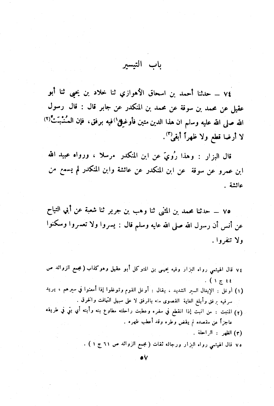 74 - حَدَّثَنَا أَحْمَدُ بْنُ إِسْحَاقَ الأَهْوَازِيُّ، ثنا خَلادُ بْنُ يَحْيَى، ثنا أَبُو عَقِيلٍ، عَنْ مُحَمَّدِ بْنِ سُوقَةَ، عَنْ مُحَمَّدِ بْنِ الْمُنْكَدِرِ، عَنْ جَابِرٍ، قَالَ: قَالَ رَسُولُ اللَّهِ صَلَّى اللَّهُ عَلَيْهِ وَسَلَّمَ: «إِنَّ هَذَا الدِّينَ مَتِينٌ فَأَوْغِلْ فِيهِ بِرِفْقٍ، فَإِنَّ الْمُنْبَتَّ لا أَرْضًا قَطَعَ وَلا ظَهْرًا أَبْقَى» .