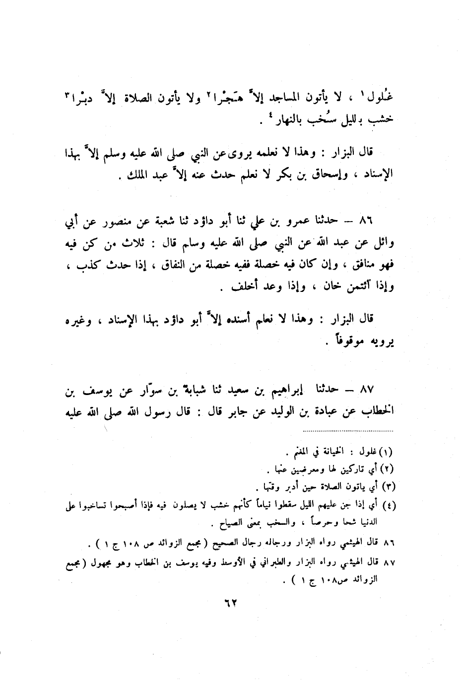 غُلُولٌ، لا يَأْتُونَ الْمَسَاجِدَ إِلا هَجْرًا، وَلا يَأْتُونَ الصَّلاةَ إِلا دَبْرًا، خُشُبٌ بِاللَّيْلِ سُخُبٌ بِالنَّهَارِ» .
