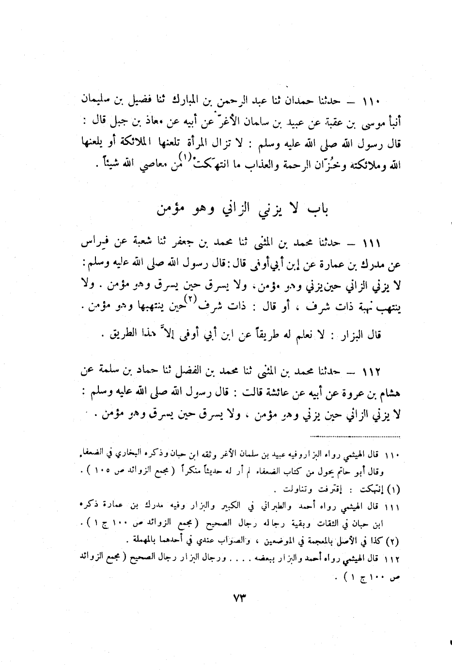112 - حَدَّثَنَا مُحَمَّدُ بْنُ الْمُثَنَّى، ثنا مُحَمَّدُ بْنُ الْفَضْلِ، ثنا حَمَّادُ بْنُ سَلَمَةَ، عَنْ هِشَامِ بْنِ عُرْوَةَ، عَنْ أَبِيهِ، عَنْ عَائِشَةَ قَالَتْ: قَالَ رَسُولُ اللَّهِ صَلَّى اللَّهُ عَلَيْهِ وَسَلَّمَ: «لا يَزْنِي الزَّانِي حِينَ يَزْنِي وَهُوَ مُؤْمِنٌ، وَلا يَسْرِقُ حِينَ يَسْرِقُ وَهُوَ مُؤْمِنٌ» .