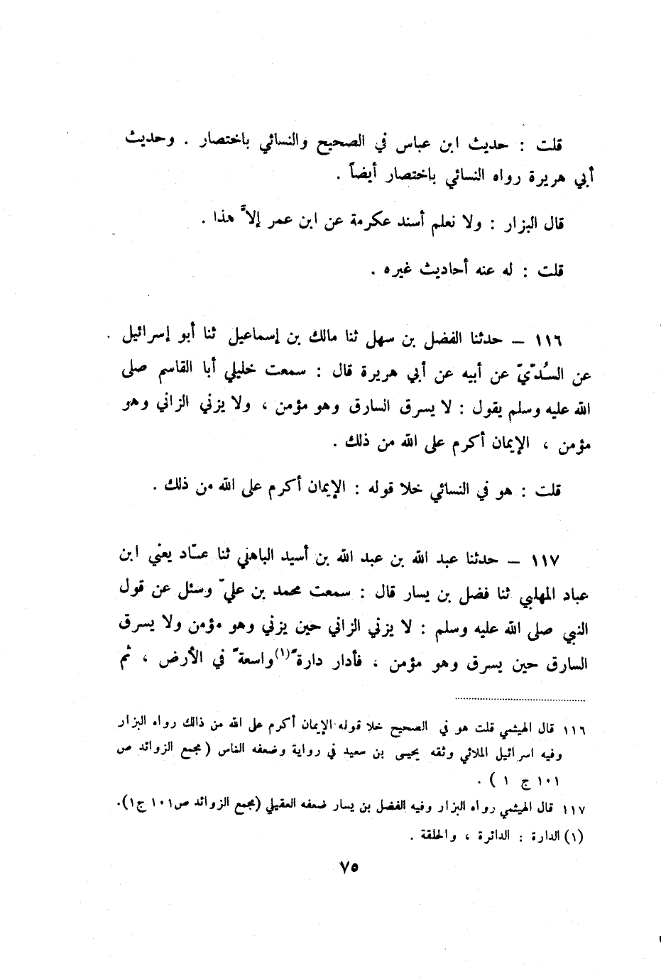 117 - حَدَّثَنَا عَبْدُ اللَّهِ بْنُ عَبْدِ اللَّهِ بْنِ أُسَيْدٍ الْبَاهِلِيُّ، ثنا عَبَّادٌ يَعْنِي: ابْنَ عَبَّادٍ الْمُهَلَّبِيَّ ثنا فَضْلُ بْنُ يَسَارٍ، قَالَ: سَمِعْتُ مُحَمَّدَ بْنَ عَلِيٍّ، وَسُئِلَ عَنْ قَوْلِ النَّبِيِّ صَلَّى اللَّهُ عَلَيْهِ وَسَلَّمَ: «لا يَزْنِي الزَّانِي حِينَ يَزْنِي وَهُوَ مُؤْمِنٌ وَلا يَسْرِقُ السَّارِقُ حِينَ يَسْرِقُ وَهُوَ مُؤْمِنٌ» .