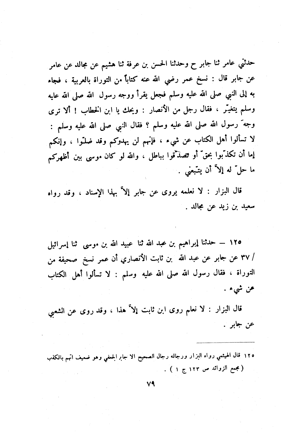 125 - حَدَّثَنَا إِبْرَاهِيمُ بْنُ عَبْدِ اللَّهِ، ثنا عُبَيْدُ اللَّهِ بْنُ مُوسَى، ثنا إِسْرَائِيلُ، عَنْ جَابِرٍ، عَنْ عَبْدِ اللَّهِ بْنِ ثَابِتٍ الأَنْصَارِيِّ، أَنَّ عُمَرَ نَسَخَ صَحِيفَةً مِنَ التَّوْرَاةِ، فَقَالَ رَسُولُ اللَّهِ صَلَّى اللَّهُ عَلَيْهِ وَسَلَّمَ: «لا تَسْأَلُوا أَهْلَ الْكِتَابِ عَنْ شَيْءٍ» .