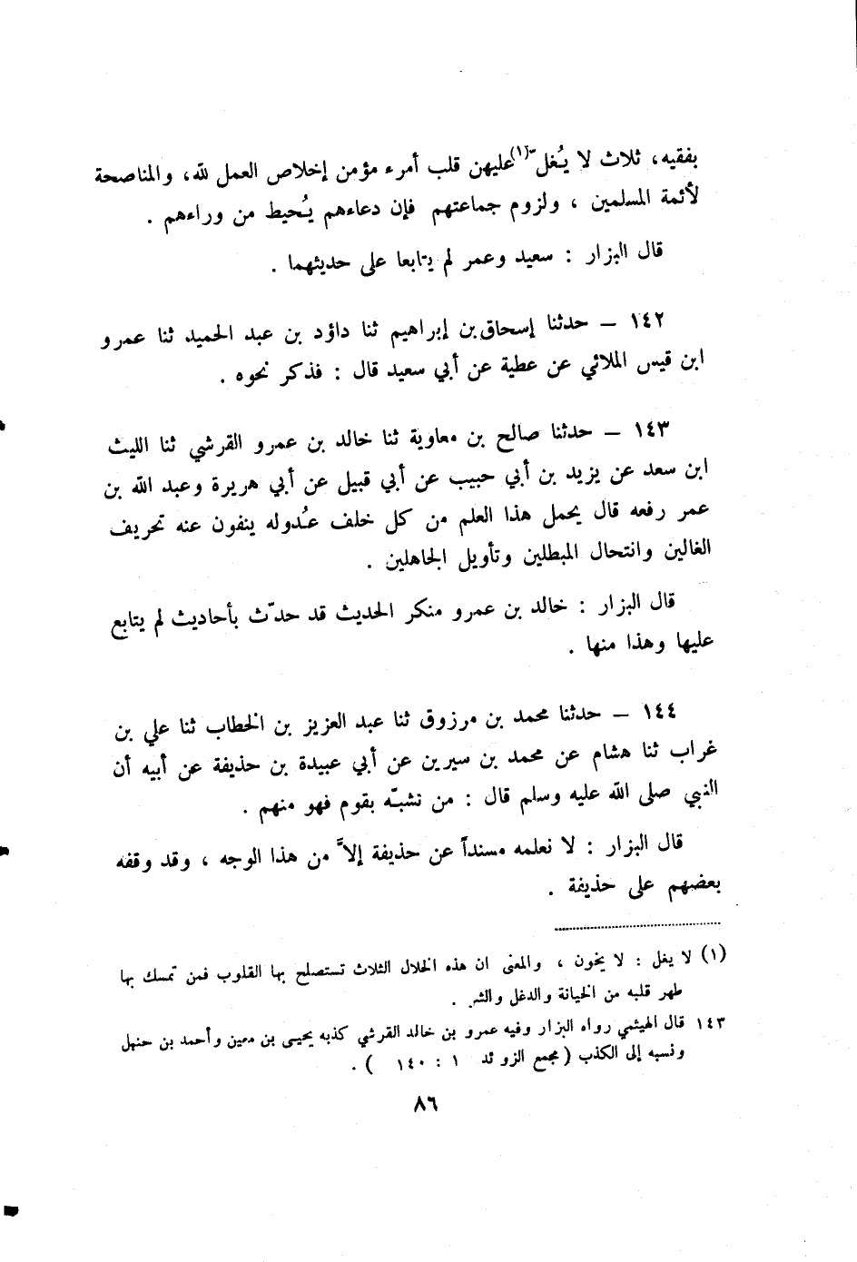 143 - حَدَّثَنَا صَالِحُ بْنُ مُعَاوِيَةَ، ثنا خَالِدُ بْنُ عَمْرٍو الْقُرَشِيُّ، ثنا اللَّيْثُ بْنُ سَعْدٍ، عَنْ يَزِيدَ بْنِ أَبِي حَبِيبٍ، عَنْ أَبِي قَبِيلٍ، عَنْ أَبِي هُرَيْرَةَ، وَعَبْدُ اللَّهِ بْنُ عُمَرَ رَفَعَهُ، قَالَ: «يَحْمِلُ هَذَا الْعِلْمَ مِنْ كُلِّ خَلَفٍ عُدُولُهُ يَنْفُونَ عَنْهُ تَحْرِيفَ الْغَالِينَ وَانْتِحَالَ الْمُبْطِلِينَ وَتَأْوِيلَ الْجَاهِلِينَ» .