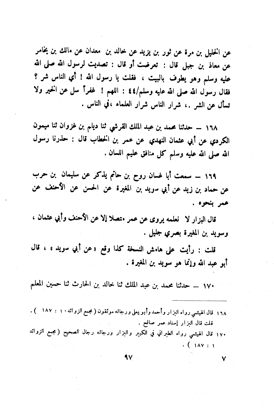 عَنِ الْخَلِيلِ بْنِ مُرَّةَ، عَنْ ثَوْرِ بْنِ يَزِيدَ، عَنْ خَالِدِ بْنِ مَعْدَانَ، عَنْ مَالِكِ بْنِ يُخَامِرَ، عَنْ مُعَاذِ بْنِ جَبَلٍ، قَالَ: تَعَرَّضْتُ أَوْ قَالَ: تَصَدَّيْتُ لِرَسُولِ اللَّهِ صَلَّى اللَّهُ عَلَيْهِ وَسَلَّمَ وَهُوَ يَطُوفُ بِالْبَيْتِ، فَقُلْتُ: يَا رَسُولَ اللَّهِ! أَيُّ النَّاسِ شَرٌّ؟ ، فَقَالَ رَسُولُ اللَّهِ صَلَّى اللَّهُ عَلَيْهِ وَسَلَّمَ: «اللَّهُمَّ! غَفْرًا سَلْ عَنِ الْخَيْرِ، وَلا تَسْأَلْ عَنِ الشَّرِّ، شِرَارُ النَّاسِ شِرَارُ الْعُلَمَاءِ فِي النَّاسِ» .