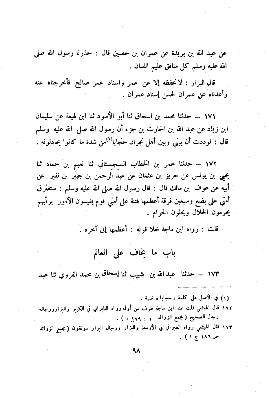 172 - حَدَّثَنَا عُمَرُ بْنُ الْخَطَّابِ السِّجِسْتَانِيُّ، ثنا نُعَيْمُ بْنُ حَمَّادٍ، ثنا يَحْيَى بْنُ يُونُسَ، عَنْ حَرِيزِ بْنِ عُثْمَانَ، عَنْ عَبْدِ الرَّحْمَنِ بْنِ جُبَيْرِ بْنِ نُفَيْرٍ، عَنْ أَبِيهِ، عَنْ عَوْفِ بْنِ مَالِكٍ، قَالَ: قَالَ رَسُولُ اللَّهِ صَلَّى اللَّهُ عَلَيْهِ وَسَلَّمَ: «سَتَفْتَرِقُ أُمَّتِي عَلَى بِضْعٍ وَسَبْعِينَ فِرْقَةً أَعْظَمُهَا فِتْنَةً عَلَى أُمَّتِي قَوْمٌ يَقِيسُونَ الأُمُورَ بِرَأْيِهِمْ يُحَرِّمُونَ الْحَلالَ وَيُحِلُّونَ الْحَرَامَ» .