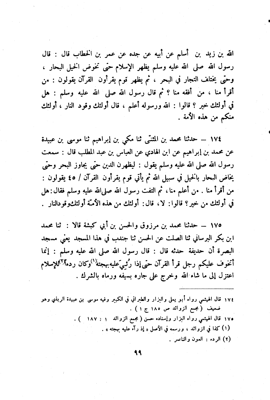 174 - حَدَّثَنَا مُحَمَّدُ بْنُ الْمُثَنَّى، ثنا مَكِّيُّ بْنُ إِبْرَاهِيمَ، ثنا مُوسَى بْنُ عُبَيْدَةَ، عَنْ مُحَمَّدِ بْنِ إِبْرَاهِيمَ، عَنِ ابْنِ الْهَادِي، عَنِ الْعَبَّاسِ بْنِ عَبْدِ الْمُطَّلِبِ، قَالَ: سَمِعْتُ رَسُولَ اللَّهِ صَلَّى اللَّهُ عَلَيْهِ وَسَلَّمَ يَقُولُ: " لَيَظْهَرَنَّ الدِّينُ حَتَّى يُجَاوِزَ الْبَحْرَ وَحَتَّى يُخَاضَ الْبِحَارُ بِالْخَيْلِ فِي سَبِيلِ اللَّهِ، ثُمَّ يَأْتِيَ قَوْمٌ يَقْرَءُونَ الْقُرْآنَ يَقُولُونَ: مَنْ أَقْرَأُ مِنَّا، مَنْ أَعْلَمُ مِنَّا "، ثُمَّ الْتَفَتَ رَسُولُ اللَّهِ صَلَّى اللَّهُ عَلَيْهِ وَسَلَّمَ فَقَالَ: «هَلْ فِي أُولَئِكَ مِنْ خَيْرٍ؟» ، قَالُوا: لا، قَالَ: «أُولَئِكَ مِنْ هَذِهِ الأُمَّةِ أُولَئِكَ وَقُودُ النَّارِ» .