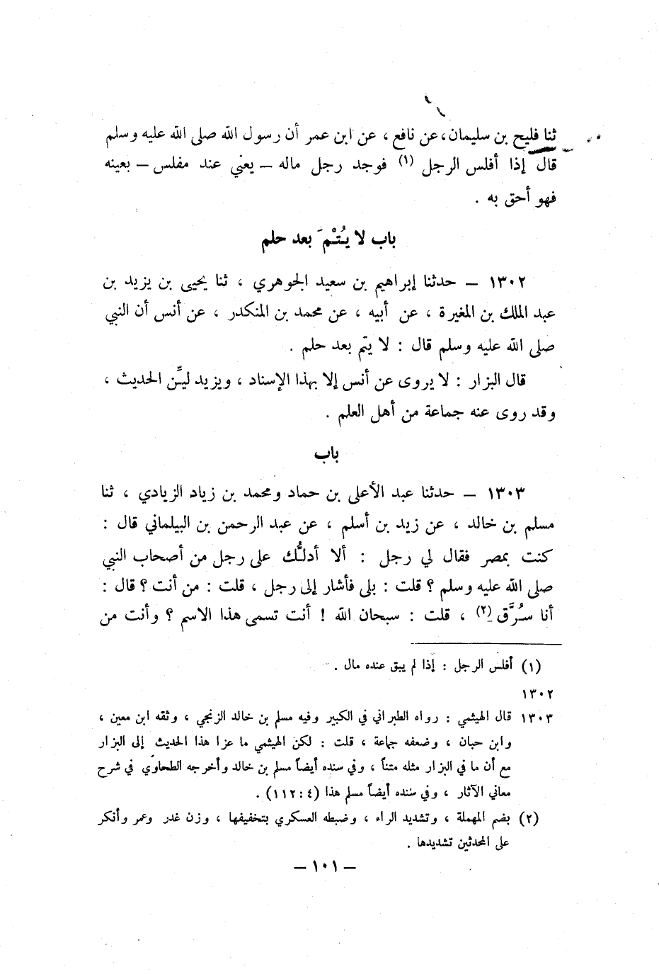 1303 - حَدَّثَنَا عَبْدُ الأَعْلَى بْنُ حَمَّادٍ، وَمُحَمَّدُ بْنُ زِيَادٍ الزِّيَادِيُّ، ثنا مُسْلِمُ بْنُ خَالِدٍ، عَنْ زَيْدِ بْنِ أَسْلَمَ، عَنْ عَبْدِ الرَّحْمَنِ بْنِ الْبَيْلَمَانِيِّ، قَالَ: كُنْتُ بِمِصْرَ، فَقَالَ لِي رَجُلٌ: أَلَا أَدُلُّكَ عَلَى رَجُلٍ مِنْ أَصْحَابِ النَّبِيِّ صَلَّى اللَّهُ عَلَيْهِ وَسَلَّمَ؟ قُلْتُ: بَلَى، فَأَشَارَ إِلَى رَجُلٍ، قُلْتُ: مَنْ أَنْتَ؟ قَالَ: أَنَا سُرَّقٌ، قُلْتُ: سُبْحَانَ اللَّهِ! أَنْتَ تُسَمَّى هَذَا الاسْمَ؟ وَأَنْتَ مِنْ
