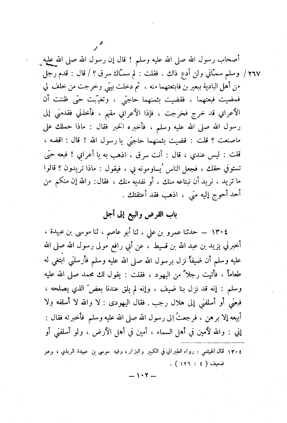 1304 - حَدَّثَنَا عَمْرُو بْنُ عَلِيٍّ، ثنا أَبُو عَاصِمٍ، ثنا مُوسَى بْنُ عُبَيْدَةَ، أَخْبَرَنِي يَزِيدُ بْنُ عَبْدِ اللَّهِ بْنِ قُسَيْطٍ، عَنْ أَبِي رَافِعٍ مَوْلَى رَسُولِ اللَّهِ صَلَّى اللَّهُ عَلَيْهِ وَسَلَّمَ، أَنَّ ضَيْفًا نَزَلَ بِرَسُولِ اللَّهِ صَلَّى اللَّهُ عَلَيْهِ وَسَلَّمَ، فَأَرْسَلَنِي أَبْتَغِي لَهُ طَعَامًا، فَأَتَيْتُ رَجُلا مِنَ الْيَهُودِ، فَقُلْتُ: يَقُولُ لَكَ مُحَمَّدٌ صَلَّى اللَّهُ عَلَيْهِ وَسَلَّمَ: إِنَّهُ قَدْ نَزَلَ بِنَا ضَيْفٌ، وَإِنَّهُ لَمْ يَلْقَ عِنْدَنَا بَعْضَ الَّذِي يُصْلِحُهُ، فَبِعْنِي أَوْ أَسْلِفْنِي إِلَى هِلالِ رَجَبٍ، فَقَالَ الْيَهُودِيُّ: لا وَاللَّهِ لا أُسْلِفُهُ وَلا أَبِيعُهُ إِلا بِرَهْنٍ، فَرَجَعْتُ إِلَى رَسُولِ اللَّهِ صَلَّى اللَّهُ عَلَيْهِ وَسَلَّمَ فَأَخْبَرْتُهُ، فَقَالَ: «إِنِّي وَاللَّهِ لأَمِينٌ فِي أَهْلِ السَّمَاءِ، أَمِينٌ فِي أَهْلِ الأَرْضِ، وَلَوْ أَسْلَفَنِي أَوْ