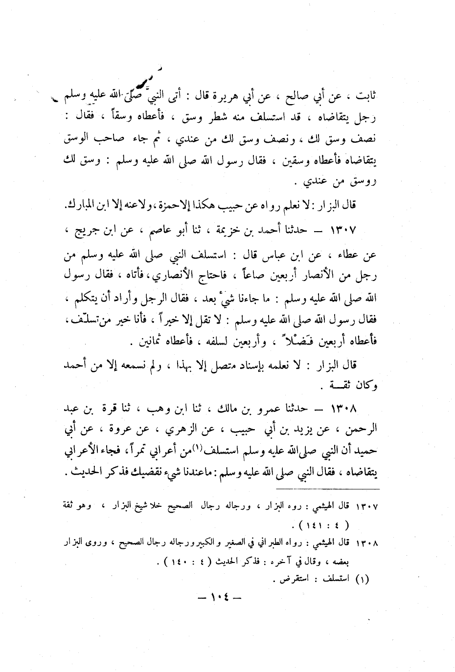 1307 - حَدَّثَنَا أَحْمَدُ بْنُ خُزَيْمَةَ، ثنا أَبُو عَاصِمٍ، عَنِ ابْنِ جُرَيْجٍ، عَنْ عَطَاءٍ، عَنِ ابْنِ عَبَّاسٍ، قَالَ: اسْتَسْلَفَ النَّبِيُّ صَلَّى اللَّهُ عَلَيْهِ وَسَلَّمَ مِنْ رَجُلٍ مِنَ الأَنْصَارِ أَرْبَعِينَ صَاعًا، فَاحْتَاجَ الأَنْصَارِيُّ، فَأَتَاهُ، فَقَالَ رَسُولُ اللَّهِ صَلَّى اللَّهُ عَلَيْهِ وَسَلَّمَ: «مَا جَاءَنَا شَيْءٌ بَعْدُ» ، فَقَالَ الرَّجُلُ وَأَرَادَ أَنْ يَتَكَلَّمَ، فَقَالَ رَسُولُ اللَّهِ صَلَّى اللَّهُ عَلَيْهِ وَسَلَّمَ: «لا تَقُلْ إِلا خَيْرًا، فَأَنَا خَيْرُ مَنْ تُسَلِّفُ» ، فَأَعْطَاهُ أَرْبَعِينَ فَضْلا، وَأَرْبَعِينَ لِسَلَفِهِ، فَأَعْطَاهُ ثَمَانِينَ.